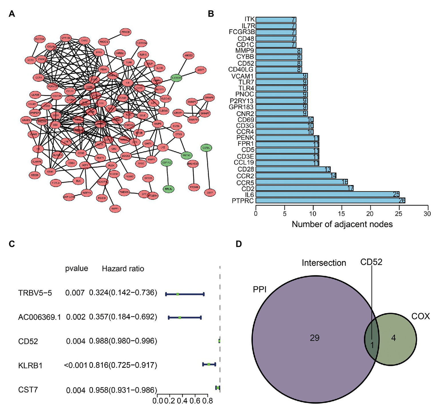 We performed univariate Cox regression analysis to identify the DEGs associated with overall survival (OS). Select DEGs with a value of p < 0.01 for further analysis. Intersecting with the results of PPI, we got the gene CD52 for further study.