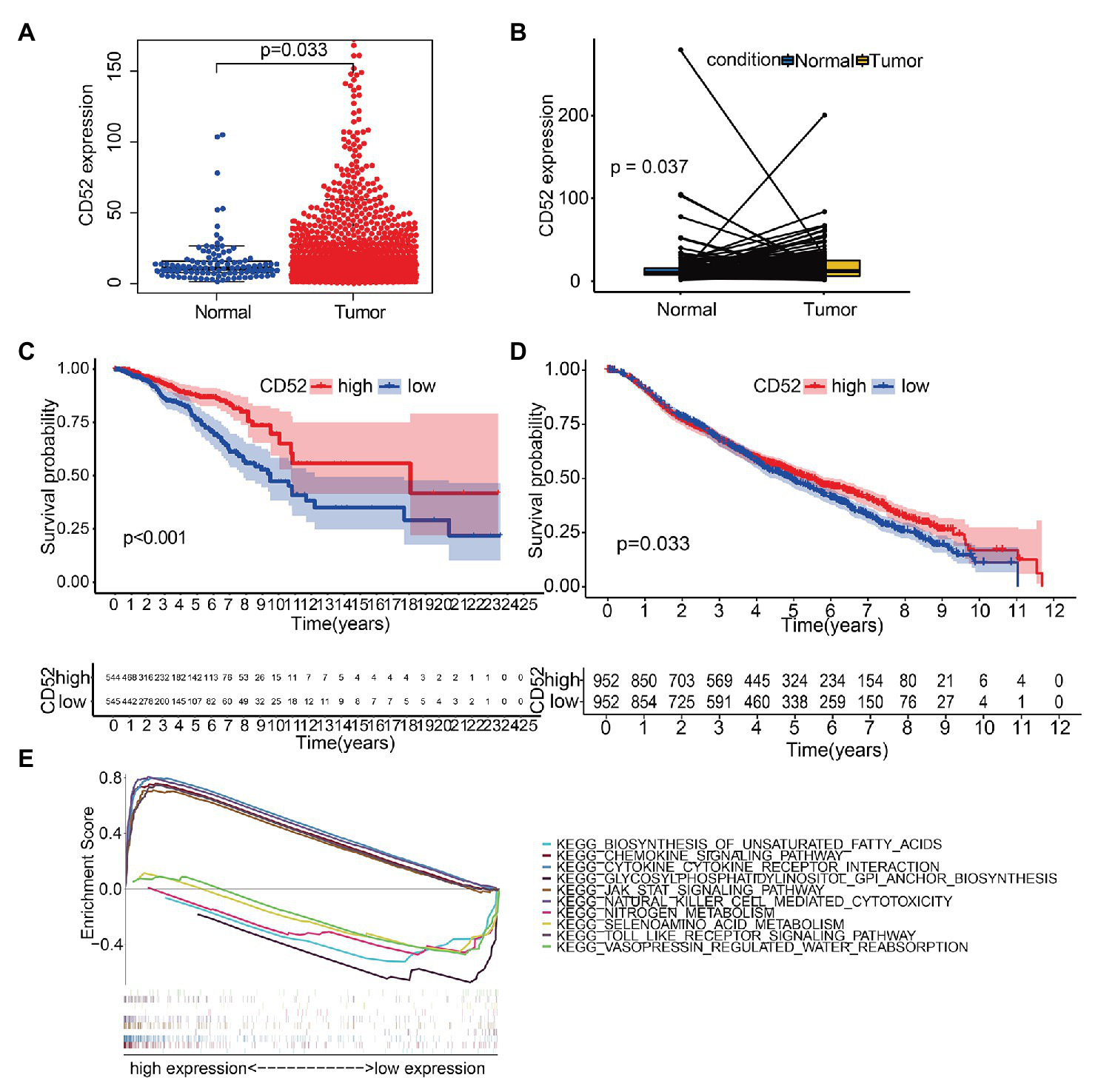 The differentiated expression of CD52, correlation with the survival of BC patients, and gene set enrichment analysis (GSEA). (A) Differentiated expression of CD52 in the normal and BC samples. (B) Paired differentiation analysis for expression of CD52. (C) Survival analysis for BC patients with different CD52 expressions in The Cancer Genome Atlas (TCGA) database. (D) Survival analysis for BC patients with different CD52 expressions in the METABRIC cohort. (E) The top five significant pathways of high and low expressions, respectively.