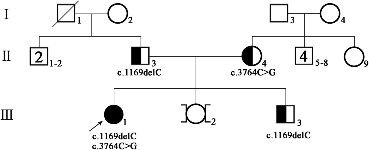 A 33-year-old Chinese woman visited the West China Second University Hospital of Sichuan University (Chengdu, China) for genetic diagnosis. The woman’s relatives informed the doctor that the proband had bilateral prelingual deafness and now was trying to conceive. At present, the proband has no other abnormal clinical manifestations except hearing impairment. The proband’s parents are healthy and have no close relative marriage. The mother of the proband denied exposure to teratogenic environmental factors during pregnancy. The pedigree of this family is shown in Figure 1. The present study was approved by the ethics committee of the West China Second University Hospital of Sichuan University, and written informed consent was obtained from the proband and family members.
