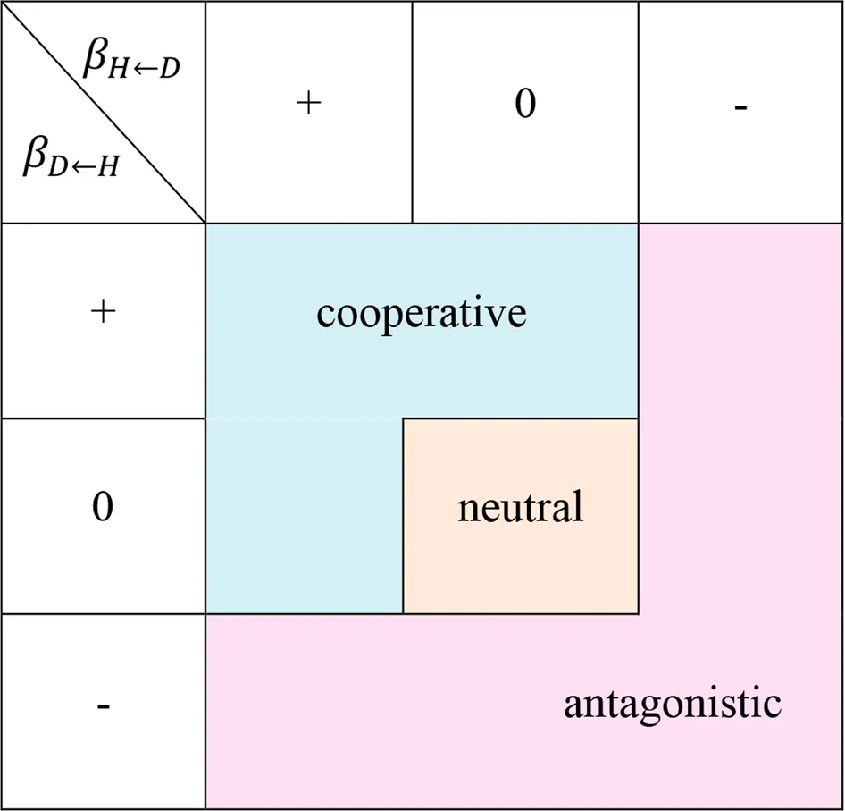 indicate the type of interactive relationship. Specifically, when the dependent parameter is positive, the growth is promoted by the coexistence characteristics. Conversely, when the dependent parameter is negative, the growth is hindered. If the dependent parameter is zero, the overall growth depends solely on independent growth, which means that there is no interaction between the two traits. The interaction of the two traits can be described by a strategy set, shown in
