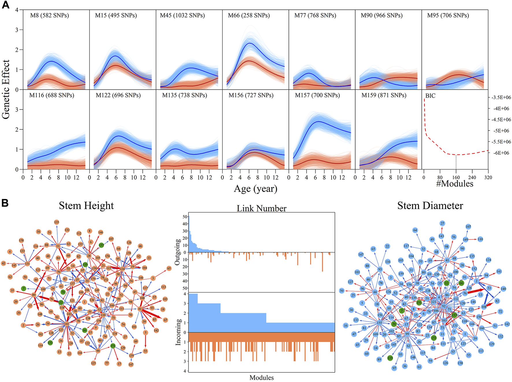 Genetic effect clusters and metagalactic network modules for stem height and stem diameter growth in an interspecific full-sib family of Populus. (A) Genetic effect curves for 17 representative modules of stem height (red) and diameter (blue) chosen from a total of 160 gene modules detected by bivariate functional clustering; Bayesian Information Criterion analysis showed 160 as the optimal number of modules. (B) Metagalactic genetic networks containing 160 modules reconstructed using the mean effect values of each module for height and diameter, where red and blue arrowed lines denote inhibition and activation effects, respectively. The thickness of lines is proportional to the strength of the regulatory interaction. Modules containing quantitative trait loci (QTLs) are highlighted by green points. The distribution of the number of outgoing links and incoming links across 160 modules for height (red, bottom) and diameter (blue, top) is enumerated between networks.