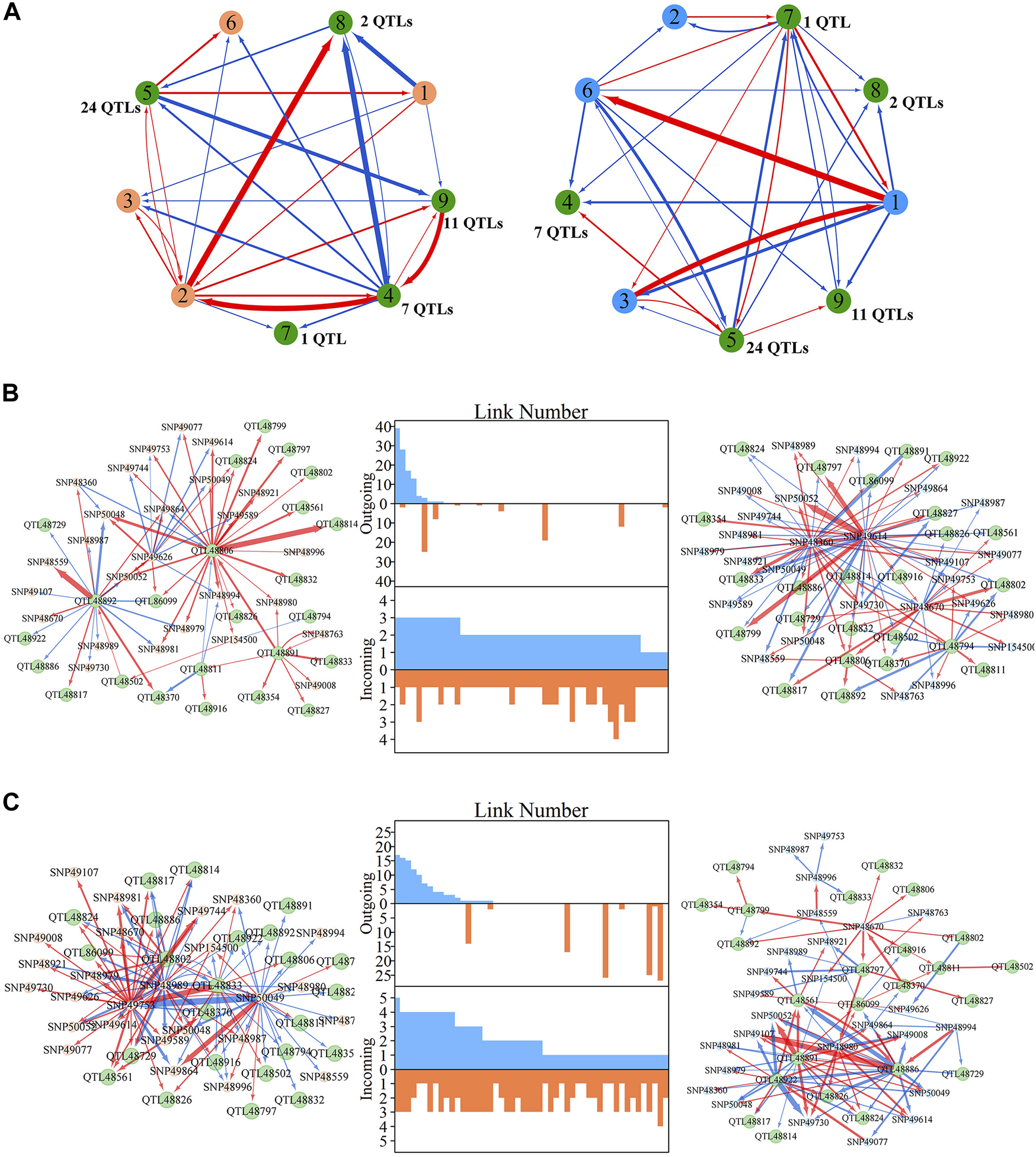 Metagalactic genetic networks of module M85 and intergalactic networks of individual single nucleotide polymorphisms (SNPs) within module SM23/M85 for stem height and diameter. (A) Genetic networks among 50 submodules within module M85. (B) Genetic networks among 20 SNPs from submodule 23, SM23/M85. (C) Independent genetic networks among 20 SNPs from submodule 23, SM23/M85. Red and blue arrowed lines stand for inhibition and activation, with the thickness of lines proportional to the strength of regulation. The distribution of the number of outgoing links and incoming links across SNPs of height (blue, top) and diameter (red, bottom) is counted between networks.