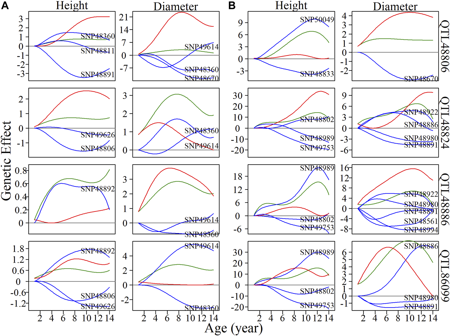 Resolution of quantitative trait locus (QTL) overall and independent effects on stem height and diameter. (A) Genetic effect curves and (B) independent genetic effect curves of four QTLs from submodule SM5/M153. The net genetic effect of each QTL (green line) is deconstructed into the independent effects (red line) and effects that are dependent on other single nucleotide polymorphisms (SNPs; blue lines).
