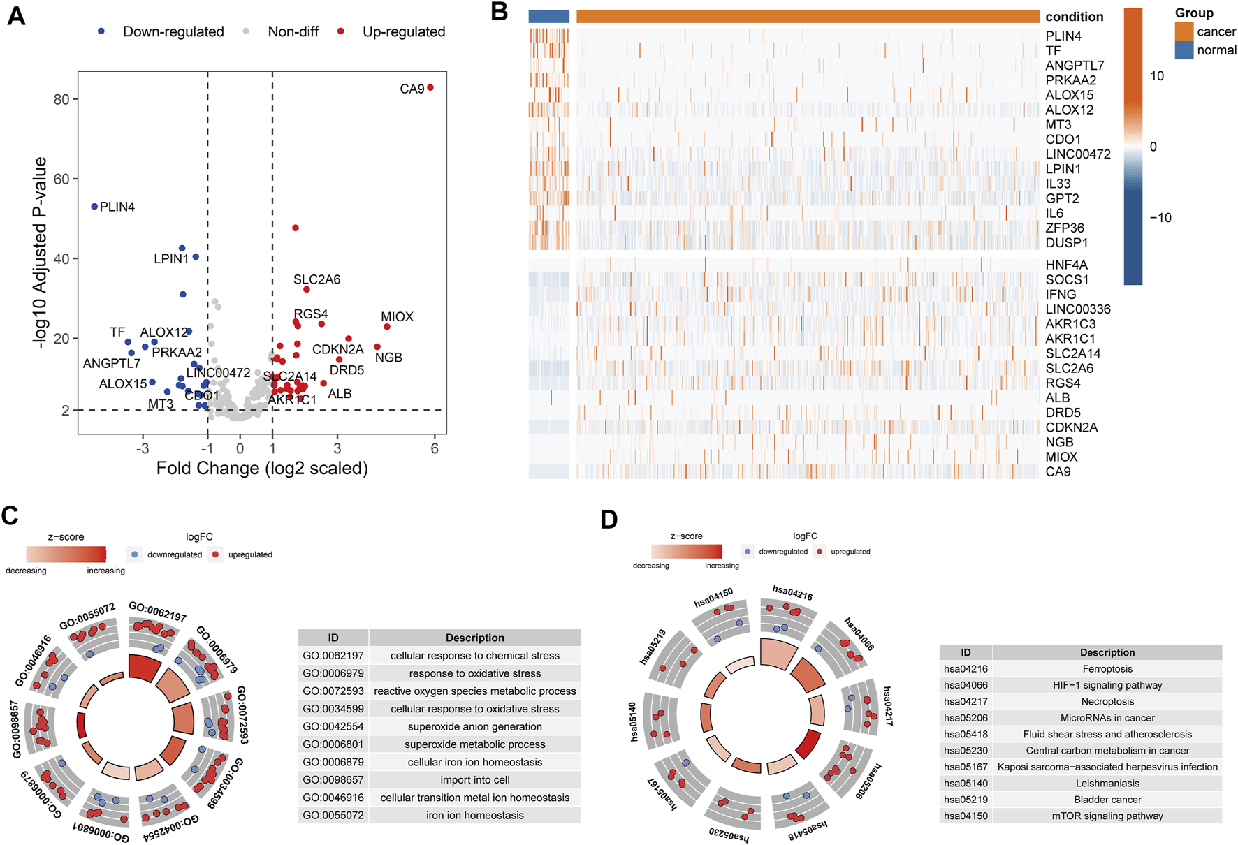 Dysregulated ferroptosis-related genes in HNSCC. (A) Volcano plot showing the differentially expressed FEGs between cancer and normal samples. Red and blue dots represent the up and downregulated FEGs, respectively. (B) Heatmap showing the top 15 up and downregulated FEGs between cancer and normal samples. C-D. Circle plot showing the z-score of significantly enriched (C) GO terms and (D) KEGG pathways. Red dots indicated upregulation, while the blue indicated downregulation. The Z-score was calculated by the R package “GOplot”. The significantly enriched GO terms and KEGG pathways are listed on the left.