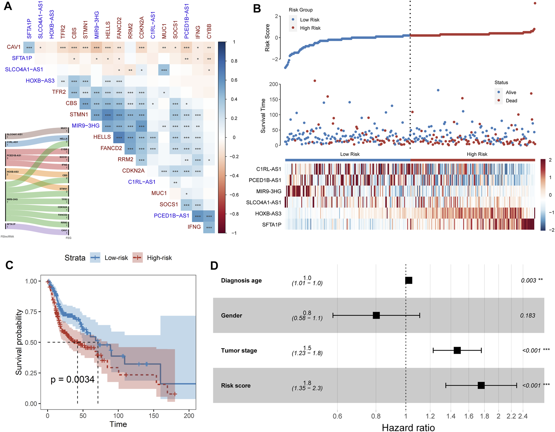 Methods: In the current study, we employed the DESeq2 method to characterize the differentially expressed ferroptosis-related genes (FEGs) between cancer and normal samples. Next, the FEG-related lncRNAs (FElncRNAs) were identified using Spearman’s correlation analysis and multiple permutation hypotheses. Subsequently, LASSO and stepwise multivariate Cox regression analyses were undertaken to recognize the prognosis-related FElncRNA signature (PFLS) and risk scores.