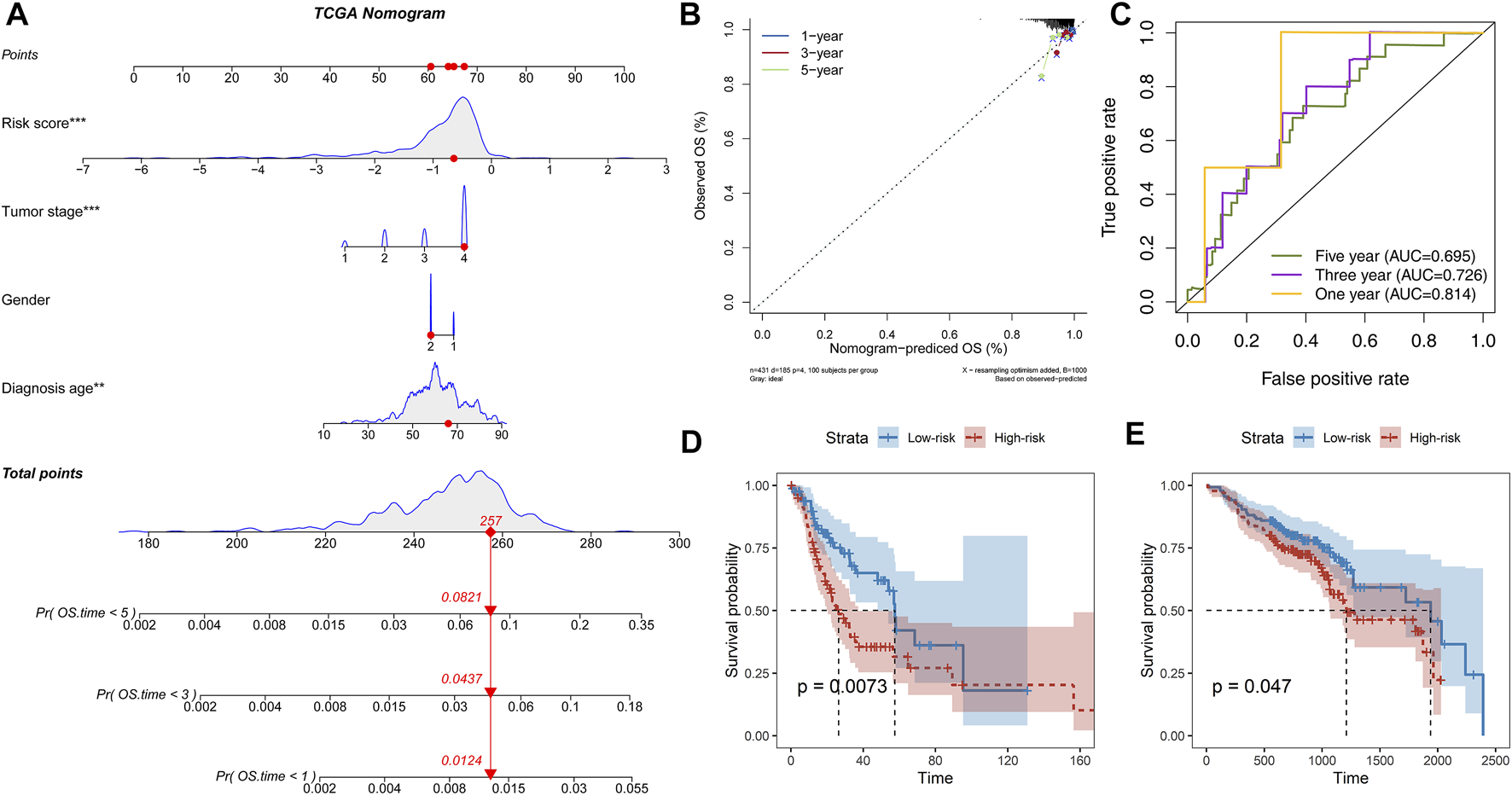 PFLS was an independent prognosis factor in HNSCC. (A) Nomogram composed of age, gender, stage, and risk score for the prediction of 1-, 3-, and 5-years OS probability. (B) Calibration for assessing the consistency between the predicted and the actual OS at 1, 3, and 5 years. (C) ROC curves at one, three, and five years were applied to verify the prognostic performance of the PFLS in the TCGA training set. D-E. The Kaplan–Meier curve of HNSCC cancer samples stratified by the risk group with the log-rank test p-value provided in (D) TCGA test set and (E) GSE65858.