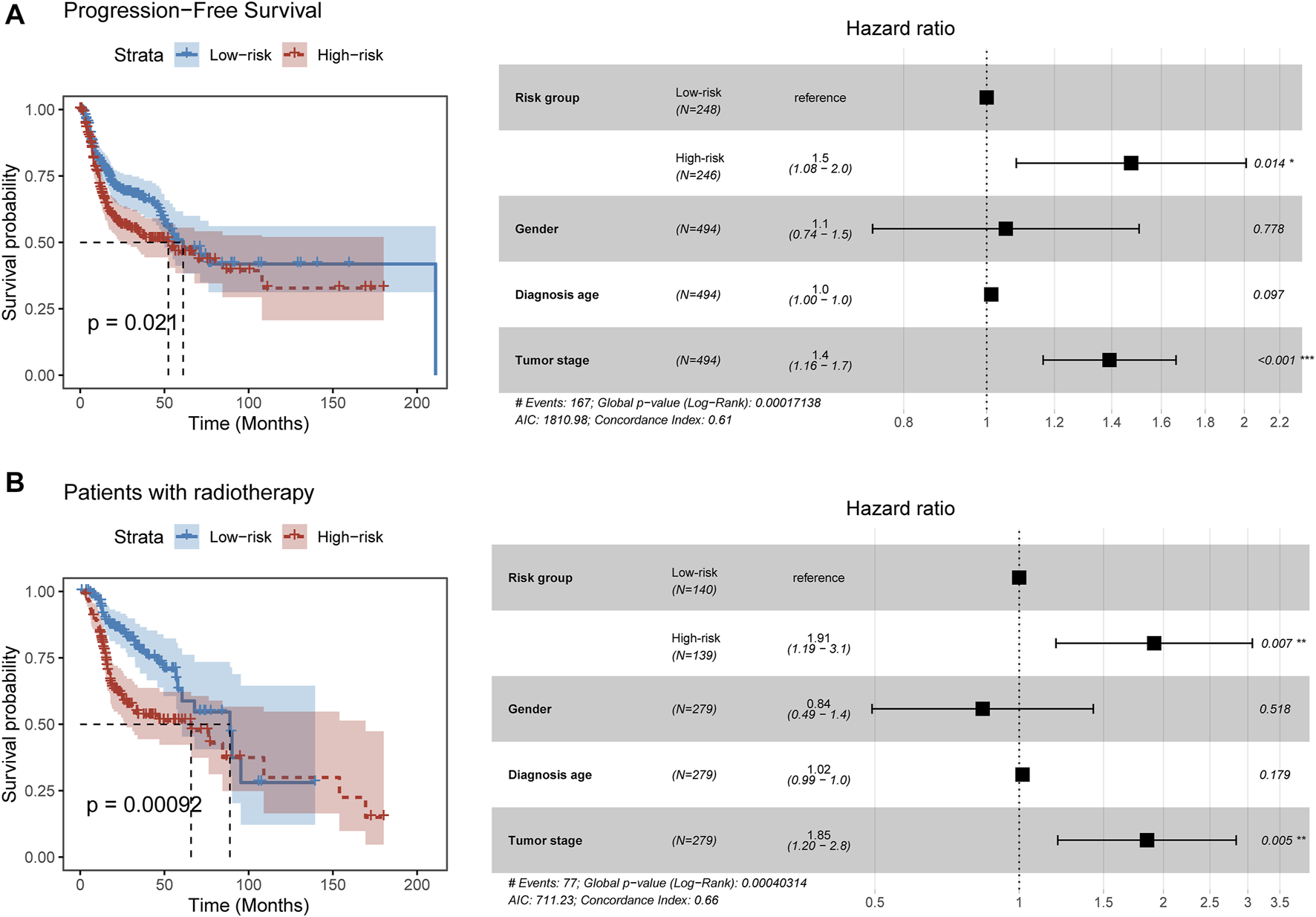 PFLS contributes to tumor progression and radiotherapy benefits. (A,B) On the left of each panel, the Kaplan–Meier curve of HNSCC cancer samples was stratified by the risk group with the log-rank test p-value provided. Forest plot showing the result of multivariate Cox regression analysis for correlation between the PFLS and clinical features and the (A) progression-free or (B) overall survival was plotted on the right.