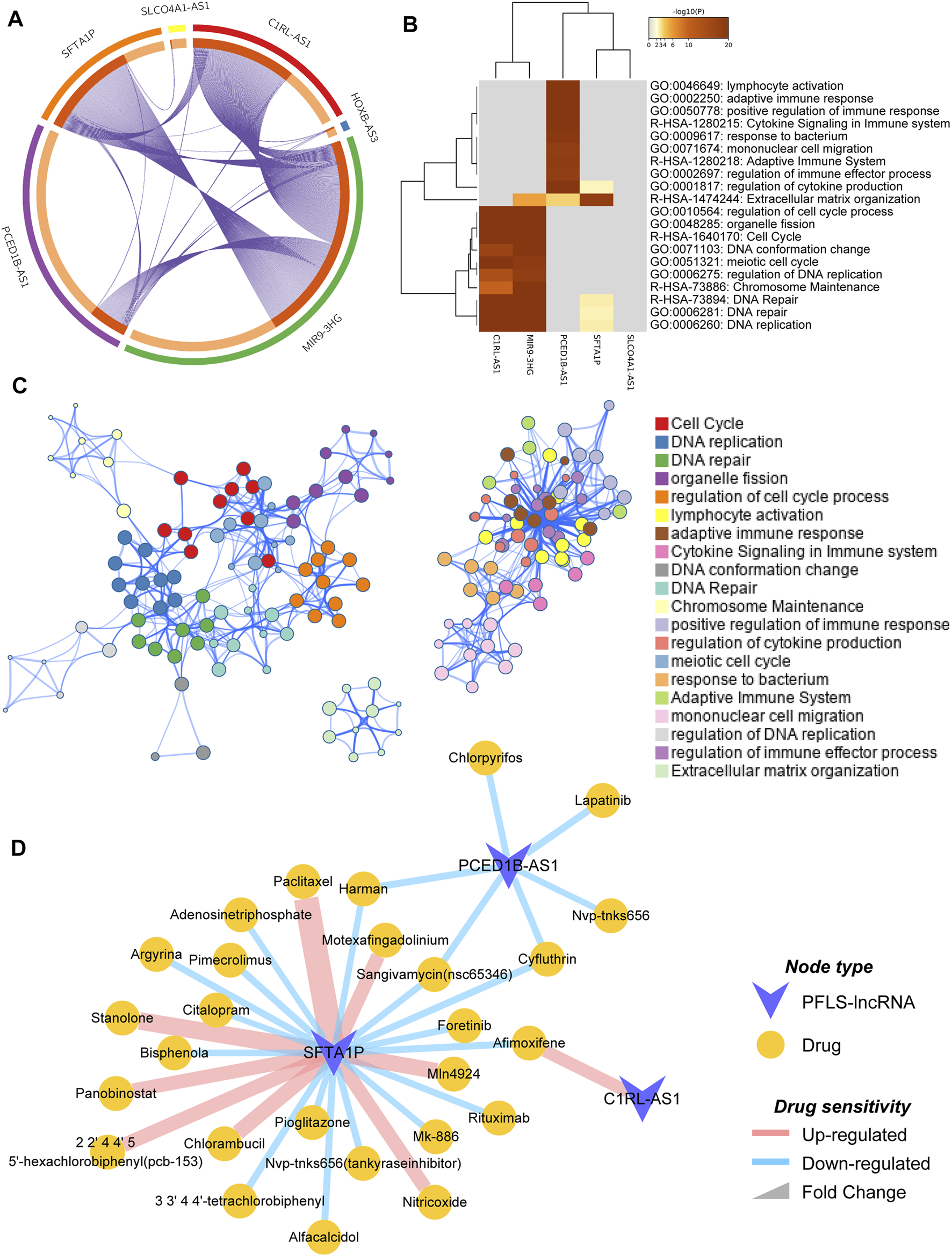 Functional enrichment analysis and potential clinical utilities of PFLS. (A) Circosplot showing the overlap among PFLS co-expressed genes. Purple curves link identical genes. The inner circle represents gene lists, where hits are arranged along the arc. Genes that hit multiple lists are colored in dark orange, and genes unique to a list are shown in light orange. (B) Network of enriched terms colored by functional clusters, where nodes that share the same functional cluster are typically close to each other. (C) Heatmap of enriched terms across PFLS co-expressed genes, colored by p-values. (D) PFLS-related drug sensitivity network.