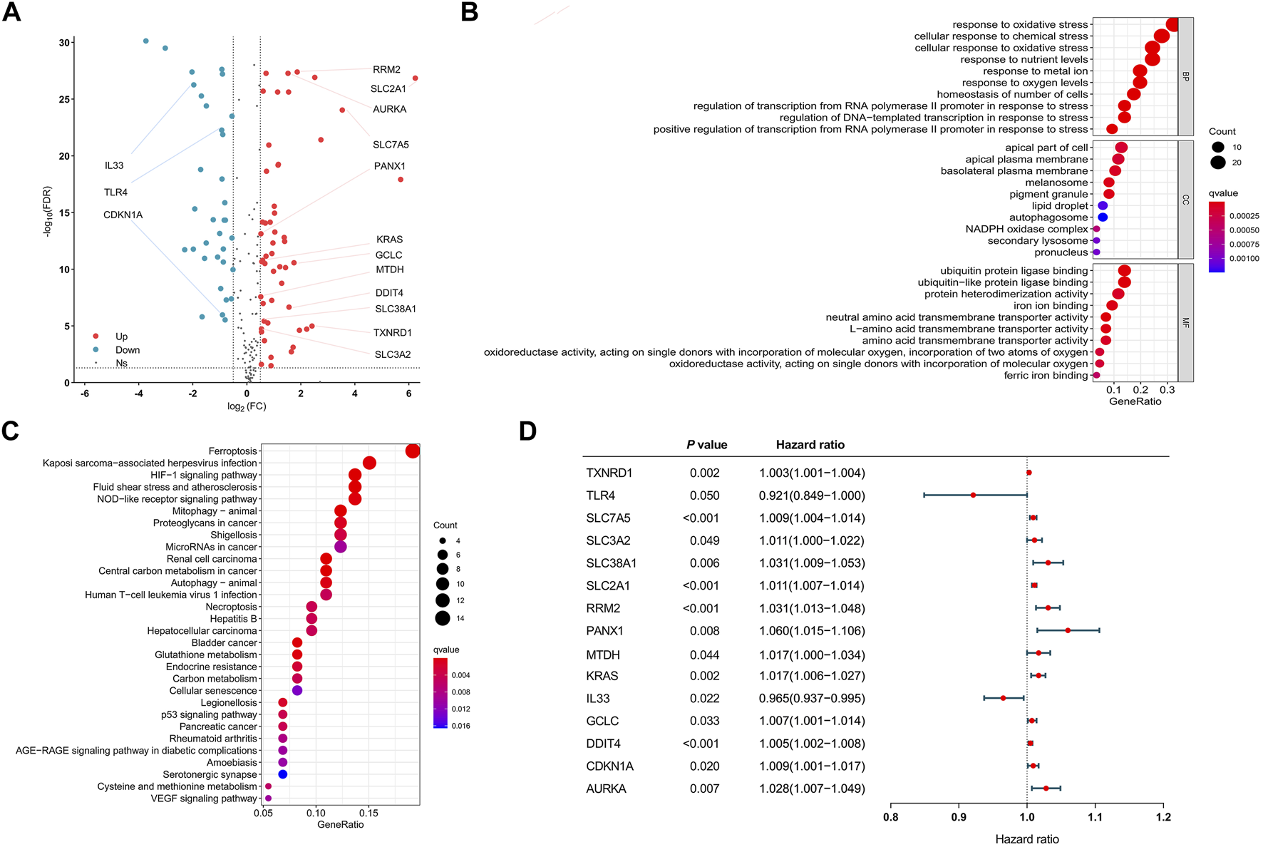 Visualization of differential ferroptosis-related genes. (A) Volcano map showing FRGs between normal and tumor tissues. (B) GO results of differentially expressed FRGs. (C) KEGG results of differentially expressed FRGs. (D) Forest plots showing the results of the univariate Cox regression analysis between DFRG expression and overall survival. GO: gene ontology. KEGG: Kyoto Encyclopedia of Genes and Genomes. FRGs: ferroptosis-related genes. DFRGs: differentially expressed ferroptosis-related genes.