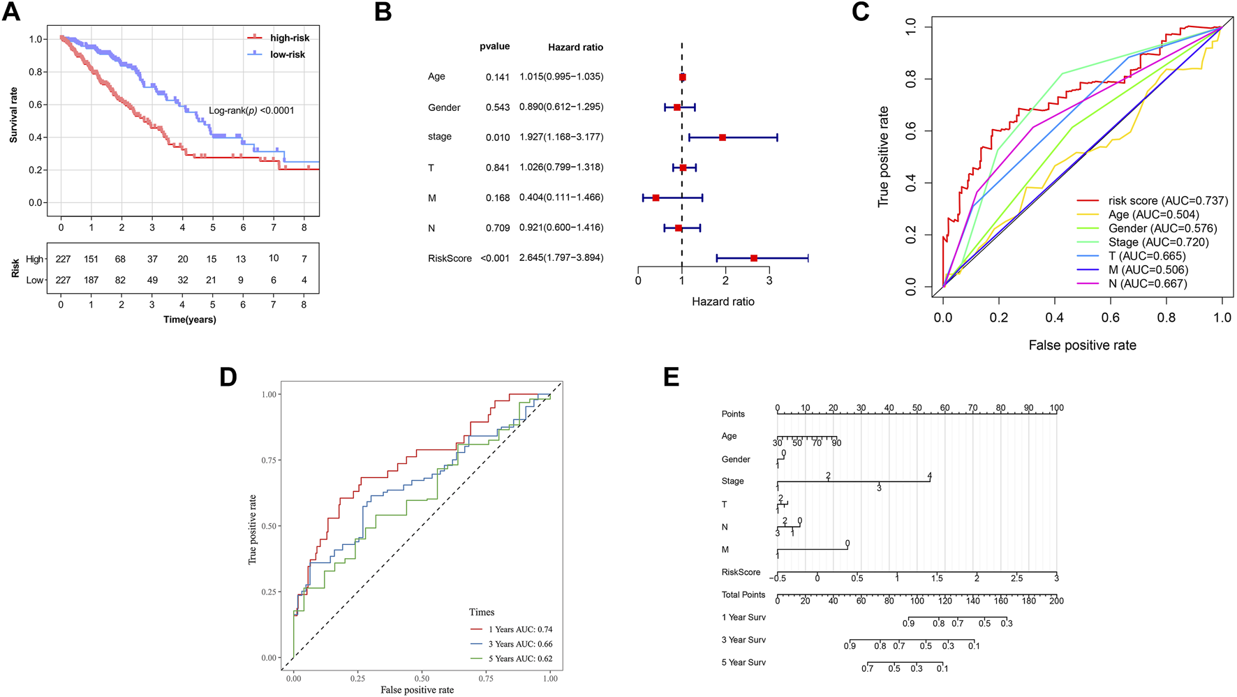 Prognostic analysis of ferroptosis-related gene signature in the TCGA tumor cohort. (A) Kaplan–Meier survival curve of the high- and low-risk groups. (B) Multivariate Cox regression analysis on overall survival. (C) ROC curves for predicting the overall survival of clinical factors and risk score. (D) ROC curves for predicting the 1-, 3-, and 5-year survival of risk score. (E) Nomogram for predicting overall survival. Gender: 1, male; 0, female. Surv: survival. ROC: receiver operating characteristic curve. AUC: area under the curve.