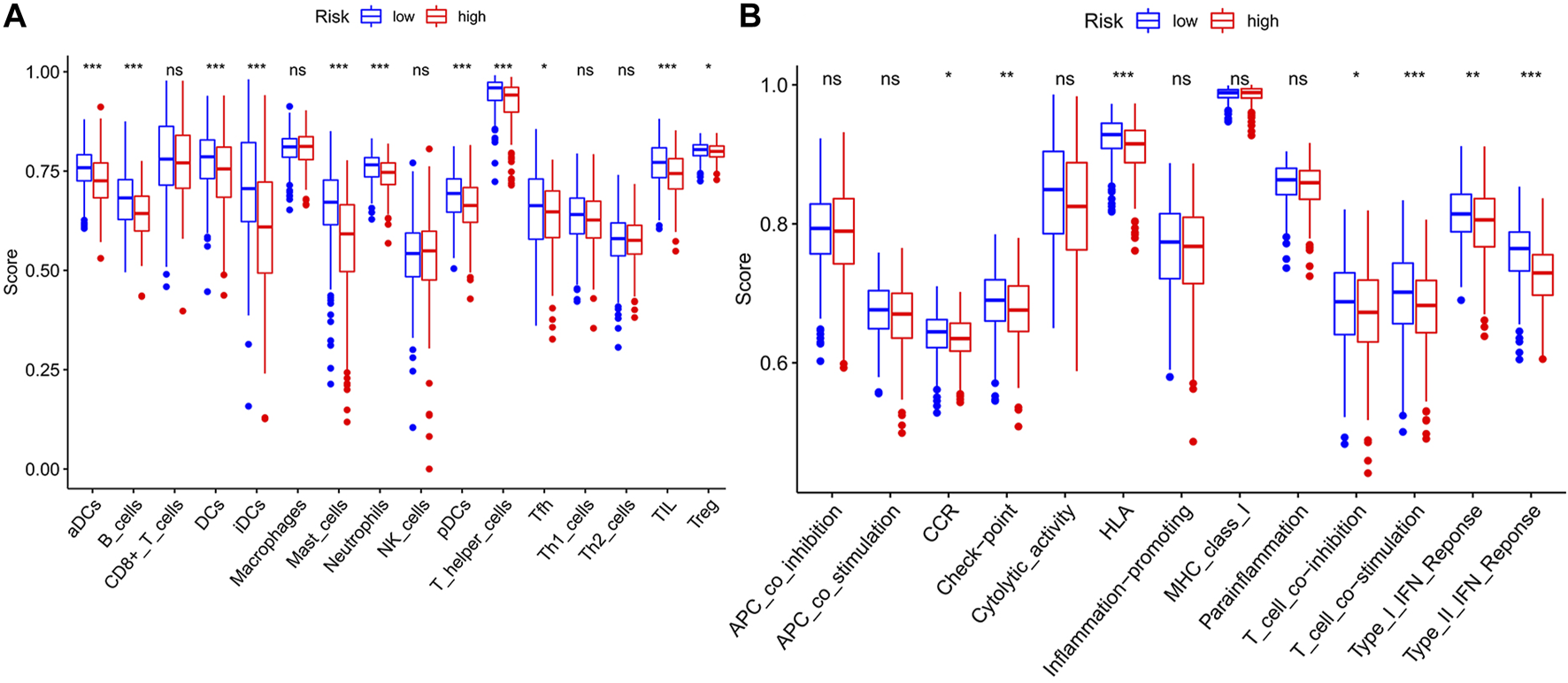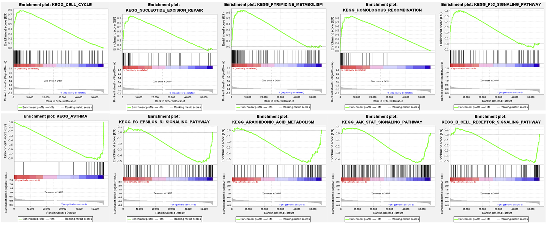 Gene set enrichment analysis (GSEA) was performed according to the GSEA software (version 4.1.0) to explore the molecular mechanism and critical signaling pathways difference between the low-risk and high-risk groups. False discovery rate (FDR) < 0.25 and nominal p value < 0.05 were considered noteworthy. Moreover, we used the single-sample GSEA (ssGSEA) and R package “GSVA” to quantify activities of tumor-infiltrating immune cells between risk groups using 29 immune signatures and find different immune responses and functions.