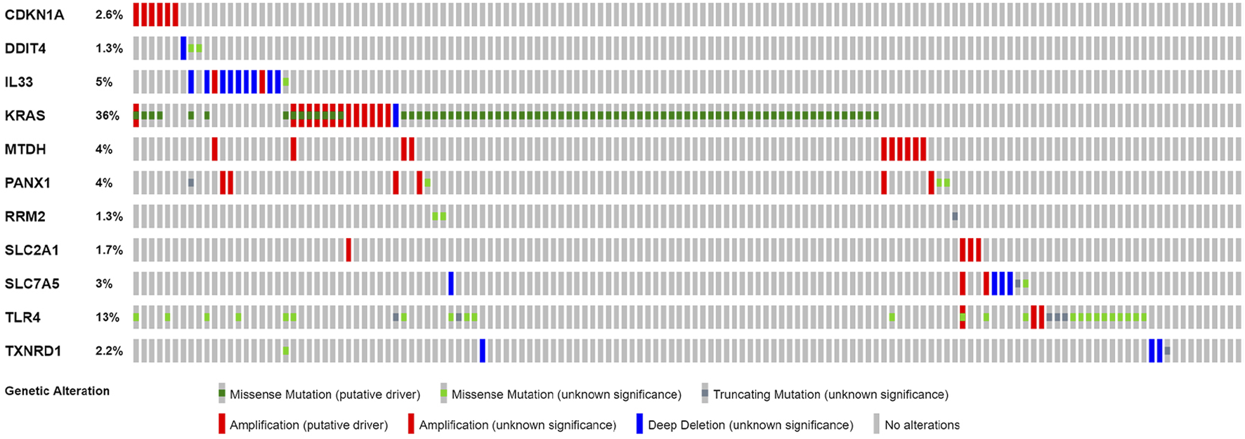 Online databases were used to study different types of gene alterations in tumors and provide distinct prognostic values in LUAD patients. We utilized the cBioPortal (http://cbioportal.org) (Wu et al., 2019), an open-access site providing download, analysis, and visualization of large-scale cancer genomics datasets, to analyze the mutations of FRGs in the prognostic model. The kmplot (https://kmplot.com) online tool was performed to assess the impact of genes expression on survival of lung cancer.