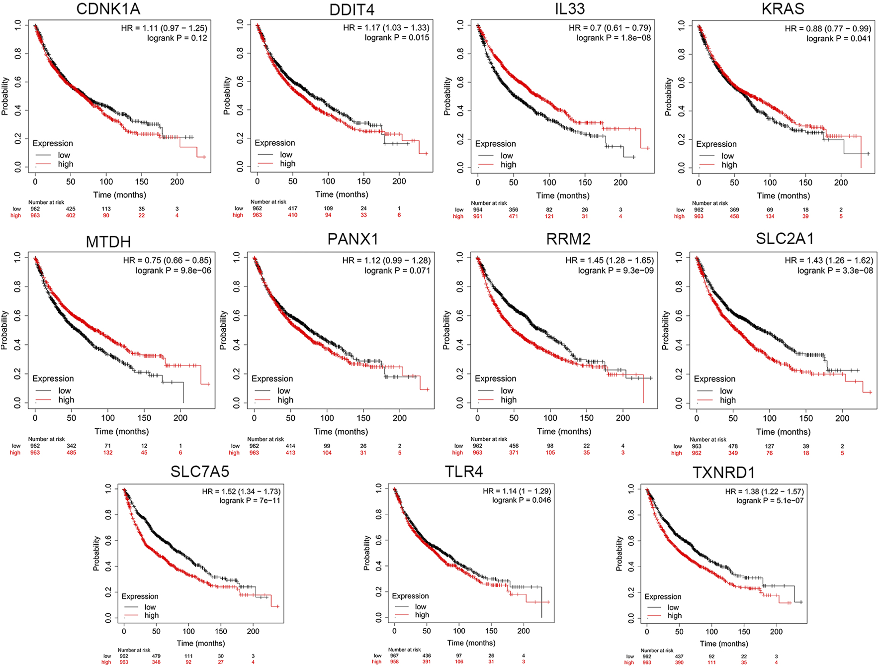 The 15 prognosis-related DEFRGs mentioned above were further analyzed by LASSO Cox regression analysis, and 11 FRGs were filtered to construct a prognostic model, including CDKN1A, DDIT4, IL33, KRAS, MTDH, PANX1, RRM2, SLC2A1, SLC7A5, TLR4, and TXNRD1. Finally, we established an 11-FRG signature to predict OS in the LUAD patients. The risk score formula was as follows: Risk score = (0.0049 × expressionCDKN1A) + (0.0037 × expressionDDIT4) - (0.0121 × expressionIL33) + (0.0057 × expressionKRAS) + (0.0089 × expressionMTDH) + (0.0169 × expressionPANX1) + (0.0060 × expressionRRM2) + (0.0057 × expressionSLC2A1) + (0.0041 × expressionSLC7A5) - (0.0380 × expressionTLR4) + (0.0003 × expressionTXNRD1).