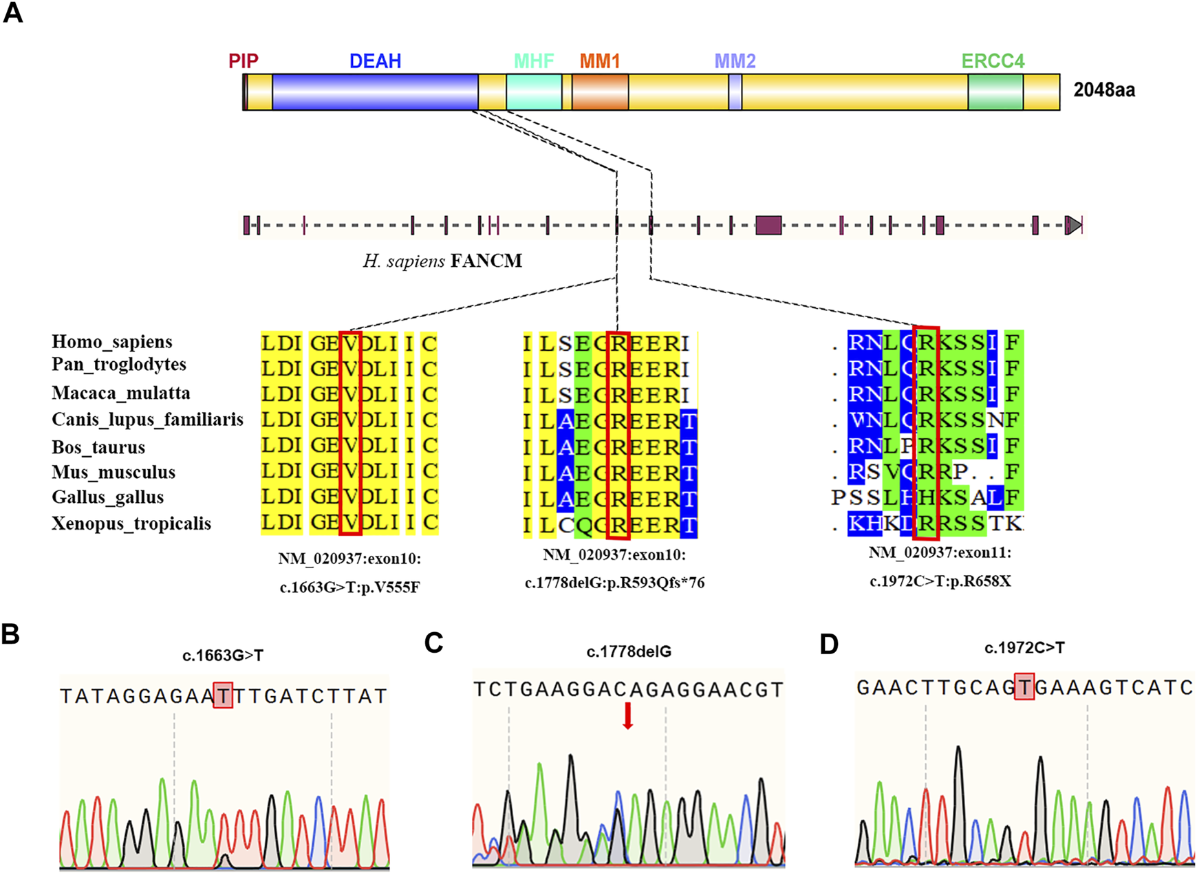 Structure of the FANCM protein and the genetic context of the FANCM variants detected in three cases diagnosed with NOA. (A) The positions of FANCM variants are shown and the conservation of the FANCM variants was analyzed. (B–D) Validation of FANCM variants identified by WES using Sanger sequencing in two brothers from the same family [(B,C), P6649, and P6649-B] and a sporadic patient [(D), P6612].