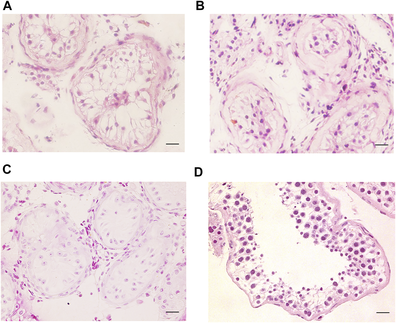 The testicular biopsies were obtained from the NOA-affected cases and the obstructive azoospermia (OA)-affected patient as the control. The testicular tissues were fixed in 4% paraformaldehyde solution overnight, embedded in paraffin, and sectioned at 5 μm thickness. Paraffin sections were dewaxed with xylene for 30 min, and then rehydrated sequentially in 95, 90, 85, and 70% ethanol each for 10 min, submerged in Phosphate-Buffered Saline (PBS) solution for 10 min, and stained with hematoxylin and eosin according to standard protocols (catalogue number: ab245880, Abcam, Cambridge, and United Kingdom). All the staining sections were captured by phase-contrast microscope to observe the structural changes of testicular tissues (Leica).