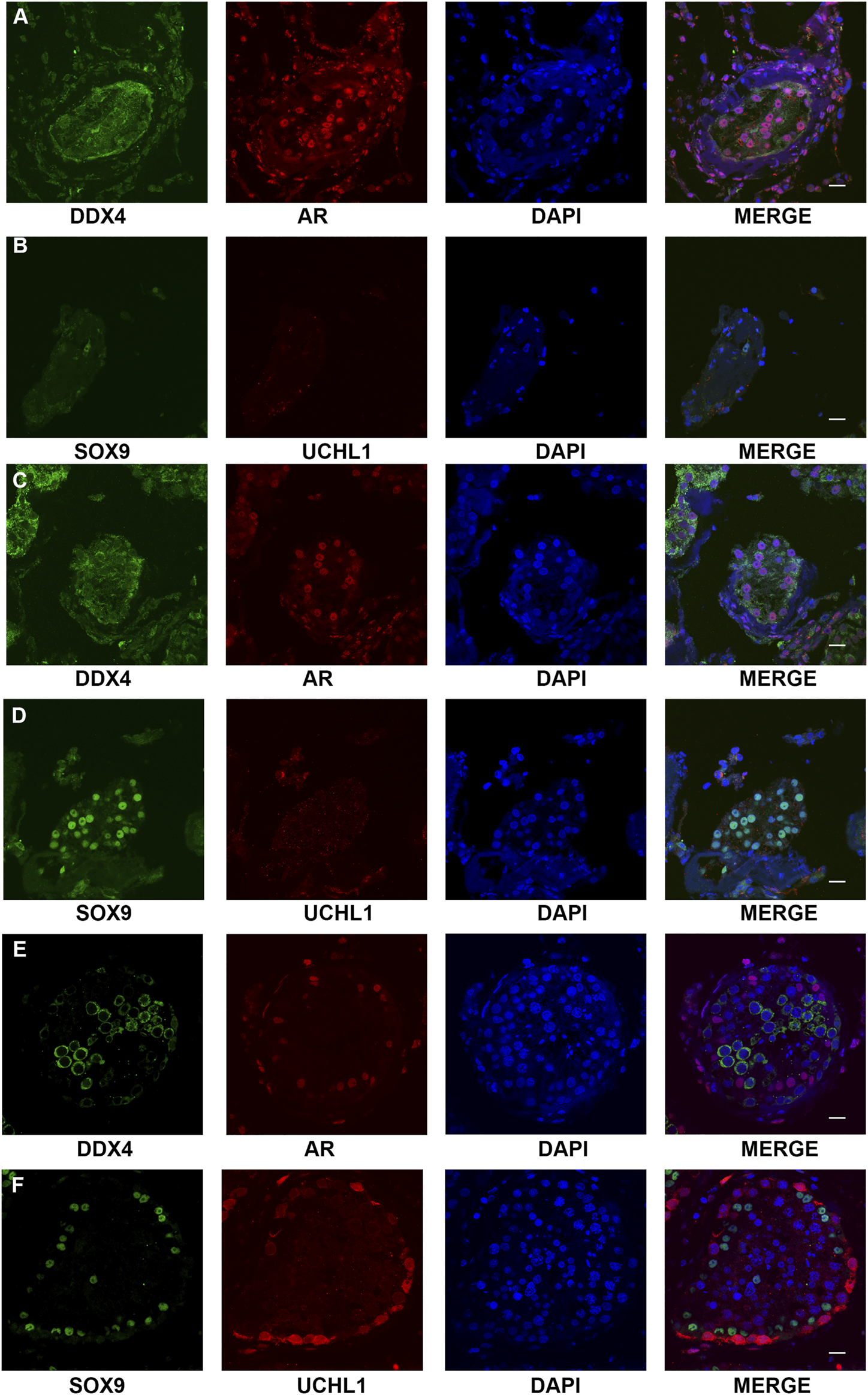 Expression of the markers of germ cells and somatic cells respectively in the testis of NOA-affected patients and patients with OA as the positive control. (A–D) IF staining results showed that there were no expressions of UCHL1 (a marker of spermatogonia) and DDX4 (hallmark of germ cells) in the testis of the proband (A,B) and his elder brother (C,D), whereas all of the cells in seminiferous tubules were positive for AR or SOX9 (markers of Sertoli cells-affected). (E,F) IF staining results showed that there was normal spermatogenesis in the OA patients. Scale bars = 20 μm in (A–E).