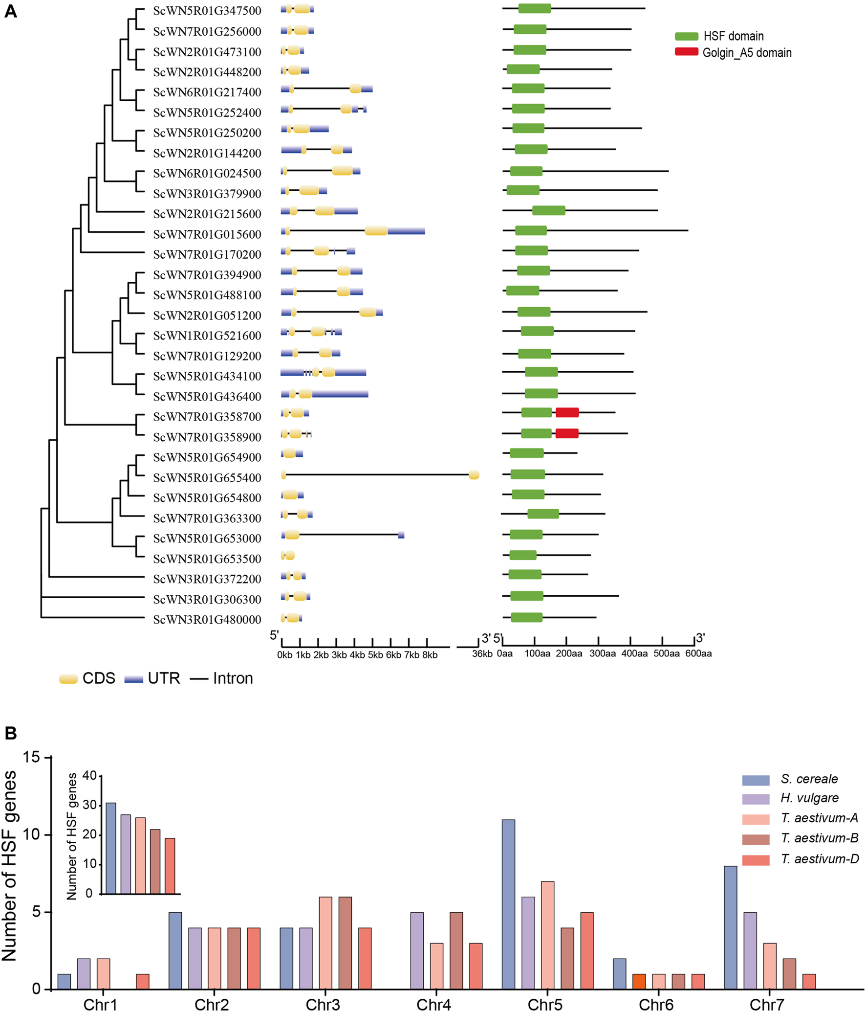 Gene structure, domain composition and chromosome distribution of S. cereale HSF genes. (A). HSF genes in the S. cereale genome were ordered by the phylogeny. Gene structure and domain composition for each gene were shown following the gene name. (B). The number of HSF genes on each chromosome in S. cereale were shown and compared to those of T. aestivum and H. vulgare.