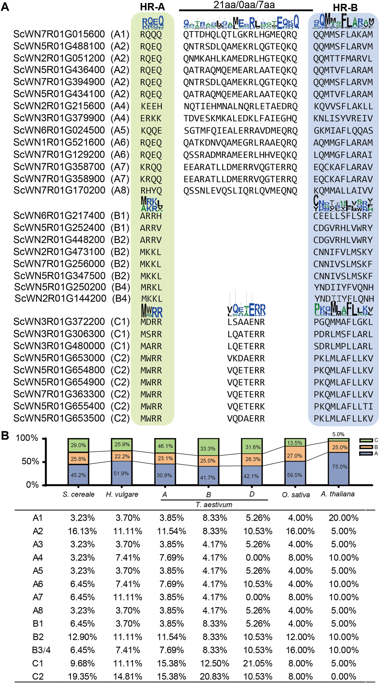 Class and subclass division of S. cereale HSF genes. (A). Classification of HSF genes in S. cereale based on protein sequence characteristics. (B). Proportion of different classes and subclasses of HSF genes in S. cereale, H. vulgare, T. aestivum (three subgenomes), O. sativa and A. thaliana respectively.