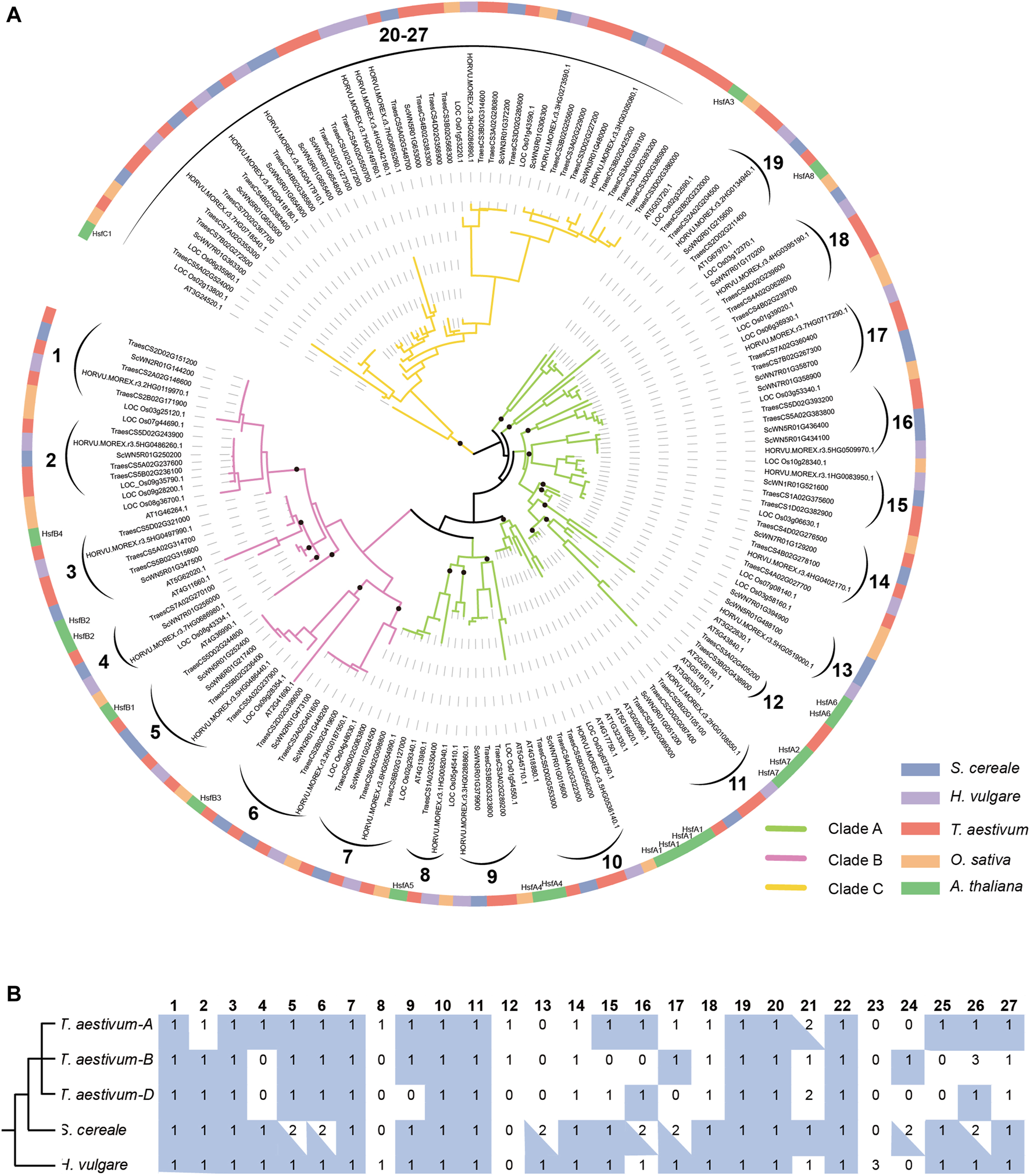 Phylogenetic analysis of HSF genes from S. cereale, H. vulgare, T. aestivum, O. sativa and A. thaliana. (A). A phylogeny of HSF genes from S. cereale, H. vulgare, T. aestivum (three subgenomes), O. sativa and A. thaliana based on the amino acid sequences of the HSF domain. Black brackets indicate a group of orthologous HSFs in Triticeae. The identification of class C Triticeae HSF orthologous group were based on an additional phylogeny provided in Supplementary Figure S2, which is constructed by using the full-length protein sequences encoded by HSFC genes. Black dots on the basal of several lineages indicate ancestral HSF lineages of monocots and dicots. (B). The number of HSF genes from different species in each Triticeae HSF orthologous group. A blue rectangle background indicates the HSF gene and HSF genes from at least one other species are in collinear blocks. A blue triangle indicates one of the HSFs in this orthologous group has a collinear relationship with HSF genes from at least one other species.