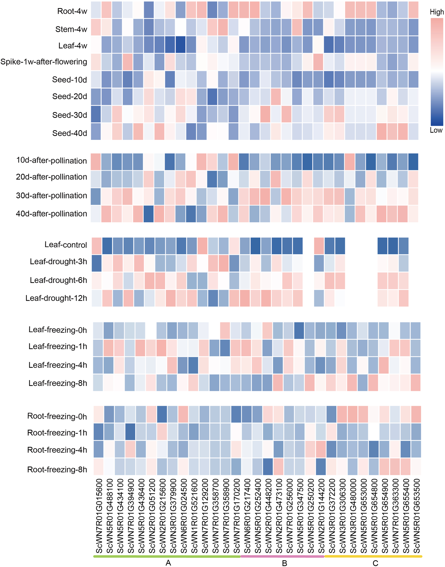 Expression analysis of HSF genes in S. cereale across different tissues, development stages and different stress treatments.