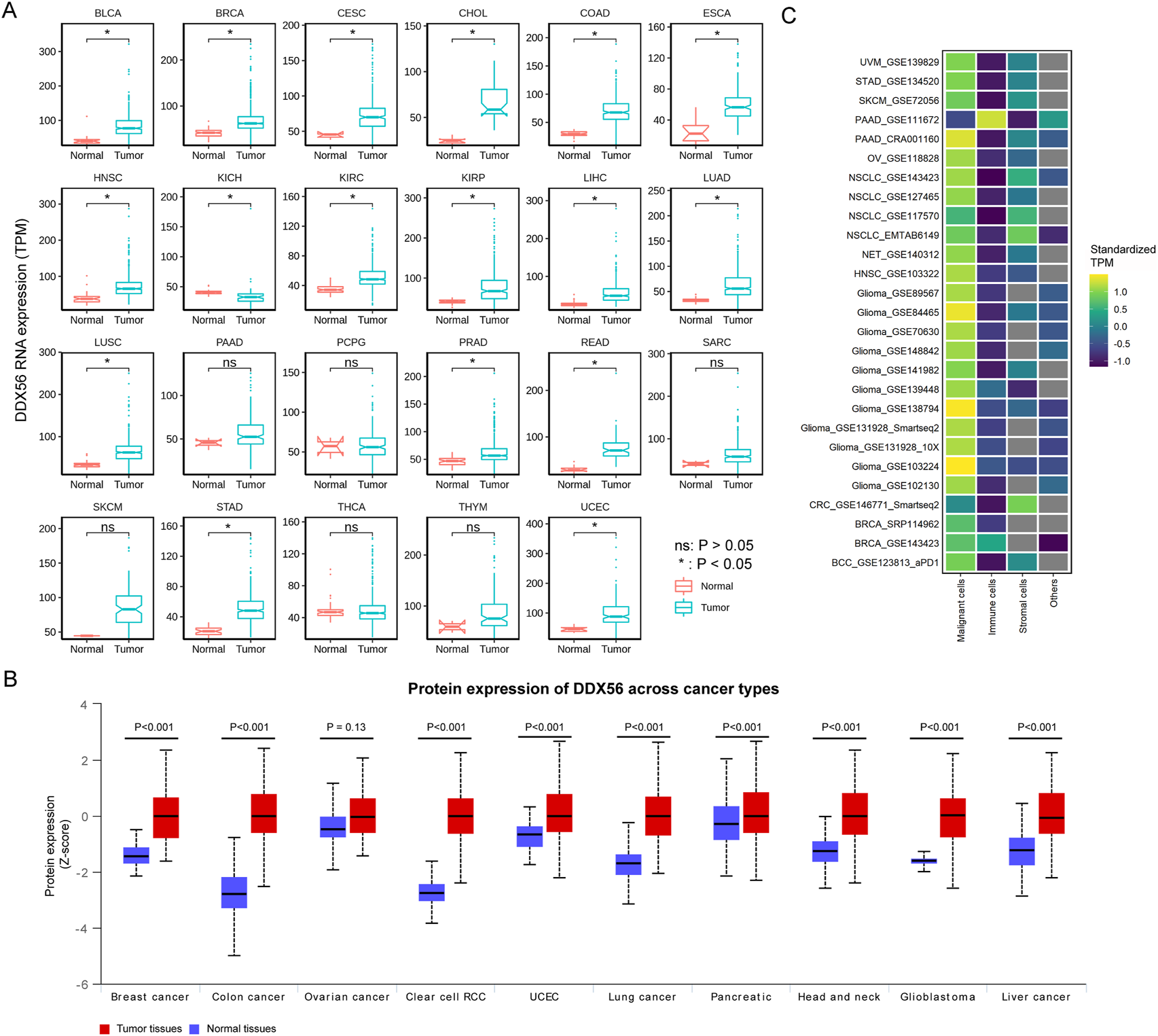 RNA and protein expression of DDX56 in various tumors. (A) Box plots showing RNA expression of DDX56 in different tissues (Wilcoxon test). P-values are marked. (B) Box plots showing protein expression levels of DDX56 in different tissues (T test). P-values are marked. (C) Heat map showing RNA expression in different cell types of various tumors. TPM values were standardized for each tumor. The colors indicate the TPM value after standardization. The X-axis indicates single-cell RNA-seq datasets. The Y-axis indicates the cell type. Abbreviations: BLCA, bladder urothelial carcinoma; BRCA, breast invasive carcinoma; CESC, cervical squamous cell carcinoma and endocervical adenocarcinoma; CHOL, cholangiocarcinoma; COAD, colon adenocarcinoma; ESCA, esophageal carcinoma; GBM, glioblastoma multiforme; HNSC, head and neck squamous cell carcinoma; KICH, kidney chromophobe; KIRC, kidney renal clear cell carcinoma; KIRP, kidney renal papillary cell carcinoma; LIHC, liver hepatocellular carcinoma; LUAD, lung adenocarcinoma; LUSC, lung squamous cell carcinoma; PAAD, pancreatic adenocarcinoma; PCPG, pheochromocytoma and paraganglioma; PRAD, prostate adenocarcinoma; READ, rectum adenocarcinoma; SARC, sarcoma; SKCM, skin cutaneous melanoma; STAD, stomach adenocarcinoma; THCA, thyroid carcinoma; THYM, thymoma; UCEC, uterine corpus endometrial carcinoma; BCC, basal cell carcinoma; NET, Neuroendocrine tumor; CRC, colorectal cancer; RCC, renal cell carcinoma.