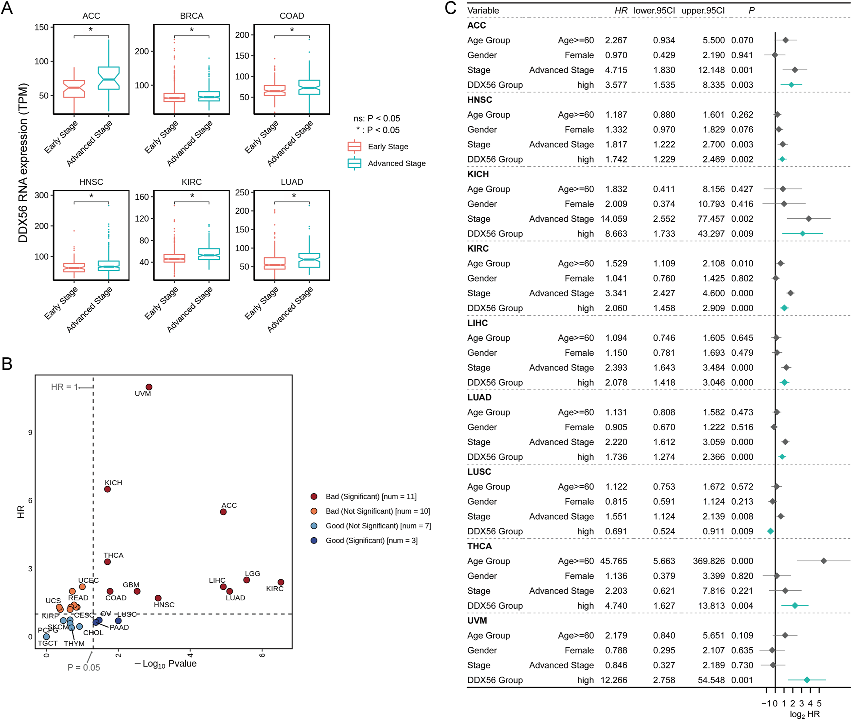 Prognostic value of DDX56 in various cancers. (A) Box plots showing RNA expression levels of DDX56 at different clinical stages. For each tumor, stages Ⅰ and Ⅱ were classified as early stage; stages Ⅲ and Ⅳ were classified as advanced stage. (B) Scatter plot showing outcomes in cancer patients with different DDX56 expression levels. Statistics were obtained by univariate Cox regression analysis. (C) Forest plot showing the results of multivariate Cox regression for multiple tumor types. Abbreviations: ACC, adrenocortical carcinoma; BRCA, breast invasive carcinoma; COAD, colon adenocarcinoma; GBM, glioblastoma multiforme; HNSC, head and neck squamous cell carcinoma; KICH, kidney chromophobe; KIRC, kidney renal clear cell carcinoma; LIHC, liver hepatocellular carcinoma; LUAD lung adenocarcinoma; LUSC, lung squamous cell carcinoma; MESO, mesothelioma; OV, ovarian serous cystadenocarcinoma; PAAD, pancreatic adenocarcinoma; PCPG, pheochromocytoma and paraganglioma; PRAD, prostate adenocarcinoma; READ, rectum adenocarcinoma; SARC, sarcoma; SKCM, skin cutaneous melanoma; STAD, stomach adenocarcinoma; TGCT, testicular germ cell tumors; THCA, thyroid carcinoma; THYM, thymoma; UCEC, uterine corpus endometrial carcinoma; UCS, uterine carcinosarcoma; UVM, uveal melanoma.