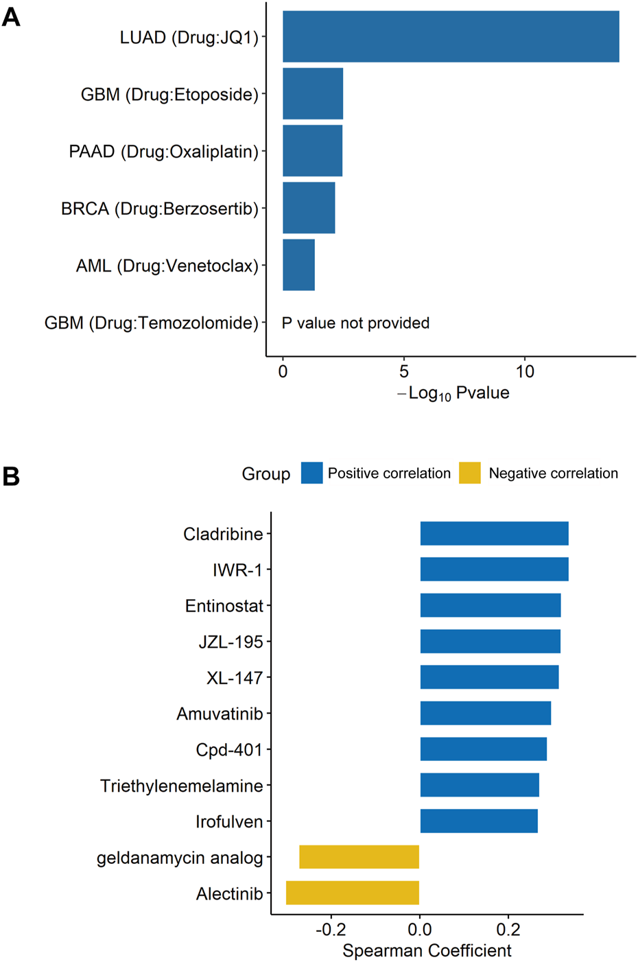 DDX56 promotes drug resistance in multiple tumor types. (A) Multiple CRISPR screening studies showing that DDX56 is associated with drug resistance. Y-axis indicates the tumor type and the associated drug. X-axis indicates the logarithm of the negative p-value of DDX56 in each CRISPR screening study. (B) Bar plot showing the Spearman coefficients for DDX56 RNA expression and drug IC50. Eleven statistically significant results were obtained from 450 drugs in the screen. Abbreviations: LUAD: lung adenocarcinoma; GBM: glioblastoma multiforme; PAAD: pancreatic adenocarcinoma; BRCA: breast invasive carcinoma; AML: acute myeloid leukemia.
