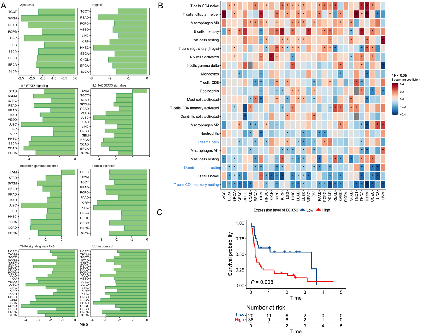 Relationships of DDX56 with tumor immune features. (A) GSEA enrichment results for DDX56 in multiple tumor types. Only pathways deemed significant enriched based on GSEA (p < 0.05) are illustrated. (B) Heat map showing Spearman coefficients for DDX56 RNA expression and proportions of tumor-infiltrating immune cells. (C) Kaplan–Meier plots showing worse clinical outcome in immunotherapy cohort patients with higher expression of DDX56. Univariate Cox regression was used to assess the statistics.
