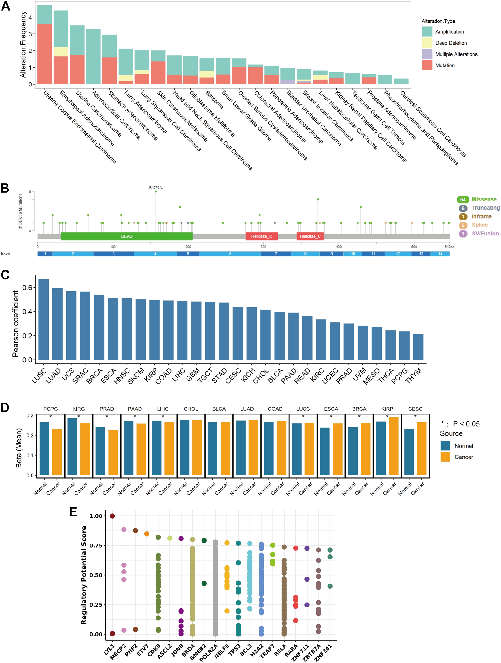 Mechanism of regulation of DDX56 expression. (A) Analysis of DDX56 alteration frequency in multiple cancer types, colored by mutation type. (B) Sites of different mutation types of DDX56. (C) Bar plot showing the Pearson correlation of CNV and DDX56 RNA expression in different tumor types. (D) Bar plot showing the DNA methylation status of DDX56 in tumors and normal tissues. Y-axis indicates the mean of the beta value. *p < 0.05. The statistics are from OncoDB. (E) Transcription factors potentially regulating DDX56 (results obtained from Toolkit). The plot illustrates the top 20 factors. Dots on a single axis line indicate the same factor. Abbreviations: ACC: adrenocortical carcinoma; BRCA: breast invasive carcinoma; COAD: colon adenocarcinoma; GBM: glioblastoma multiforme; HNSC: head and neck squamous cell carcinoma; KICH: kidney chromophobe; KIRC: kidney renal clear cell carcinoma; LIHC: liver hepatocellular carcinoma; LUAD: lung adenocarcinoma; LUSC: lung squamous cell carcinoma; MESO: mesothelioma; OV: ovarian serous cystadenocarcinoma; PAAD: pancreatic adenocarcinoma; PCPG: pheochromocytoma and paraganglioma; PRAD: prostate adenocarcinoma; READ: rectum adenocarcinoma; SARC: sarcoma; SKCM: skin cutaneous melanoma; STAD: stomach adenocarcinoma; TGCT: testicular germ cell tumors; THCA: thyroid carcinoma; THYM: thymoma; UCEC: uterine corpus endometrial carcinoma; UCS: uterine carcinosarcoma; UVM: uveal melanoma.