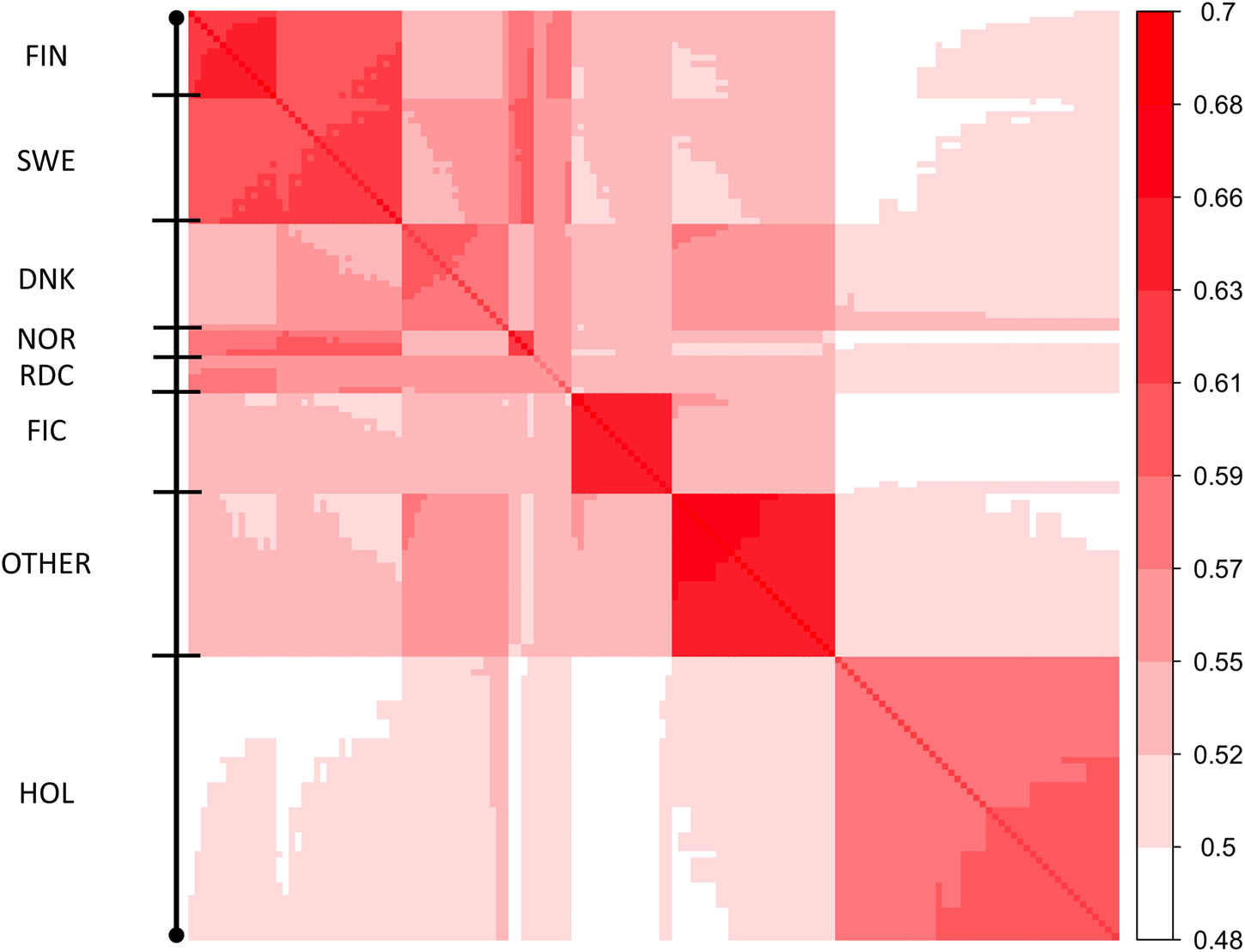 Genomic data were used from 206,140 RDC animals (6,018 proven bulls and 85,142 cows with records) and 1,335 FIC animals (160 proven bulls and 845 cows with records). Before 2019 the bulls were genotyped with Illumina Bovine SNP50 array and most cows with Illumina Bovine LD array (Illumina, San Diego, CA, USA). Since 2019 both bulls and cows were genotyped with Eurogenomics EG MD array (https://www.eurogenomics.com/). Quality control and imputation of genotypes to 46,914 SNPs were performed by NAV (Nordic Genetic Evaluation, Denmark). Genomic markers were not filtered on minor allele frequency and no edits were done concerning across and within breeds polymorphism. HOL genotypes were not presented in the current study.