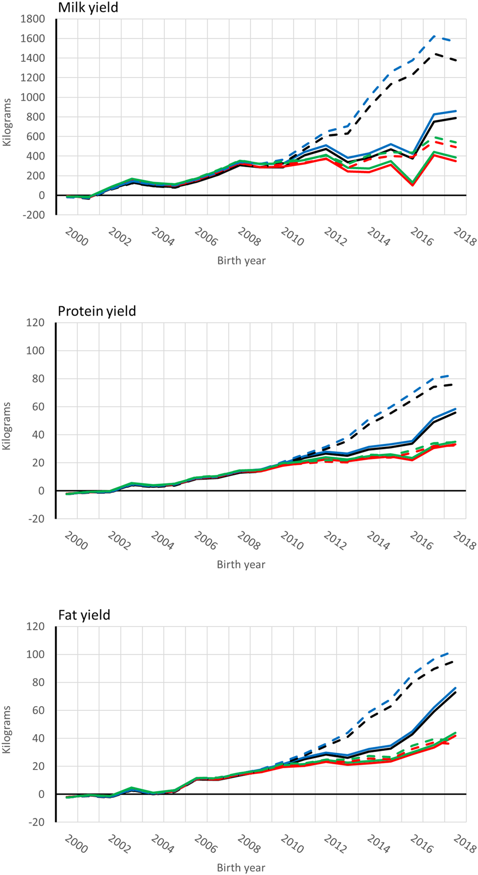 Data were 305-day milk, protein, and fat yield records from three lactations of Nordic Red Dairy Cattle (RDC), Finnish Holstein (HOL), and Finncattle (FIC) cows. Records were from January 1988 to June 2021. The total number of records by trait were: 9.45, 8.99, and 8.98 million for milk, protein, and fat, respectively (Table 1). Pedigree included 6.05 million cows and 118,363 bulls, of which 8,427 were RDC and 278 were FIC proven bulls. Genetic groups were defined as breed x country x five- or 10-year period for RDC, and as breed x five- or 10-year period for HOL, FIC, and other breeds. In total, there were 148 groups: 61 RDC, 45 HOL, 16 FIC, and 26 for breed group OTHER. The group OTHER included 23 breeds majorly beef cattle.