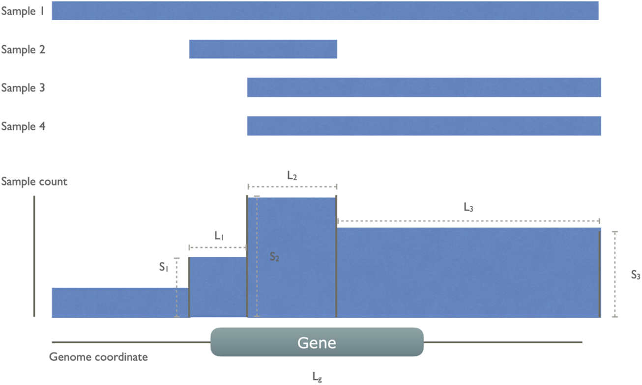 An illustration of gene score calculation The gene score was defined to reward the high number of sample recurrence and penalize the length of segments and genes. In this example, there are four cancer samples, all of which have a whole or partial deletion on the indicated gene g. These CN segments are collapsed to a collective track, leaving four collective segments of which only three of them overlap with the gene. The gene score sums over these three segments (i) with count of involved sample Si divided by the sum of segment length Li and the common gene length Lg.