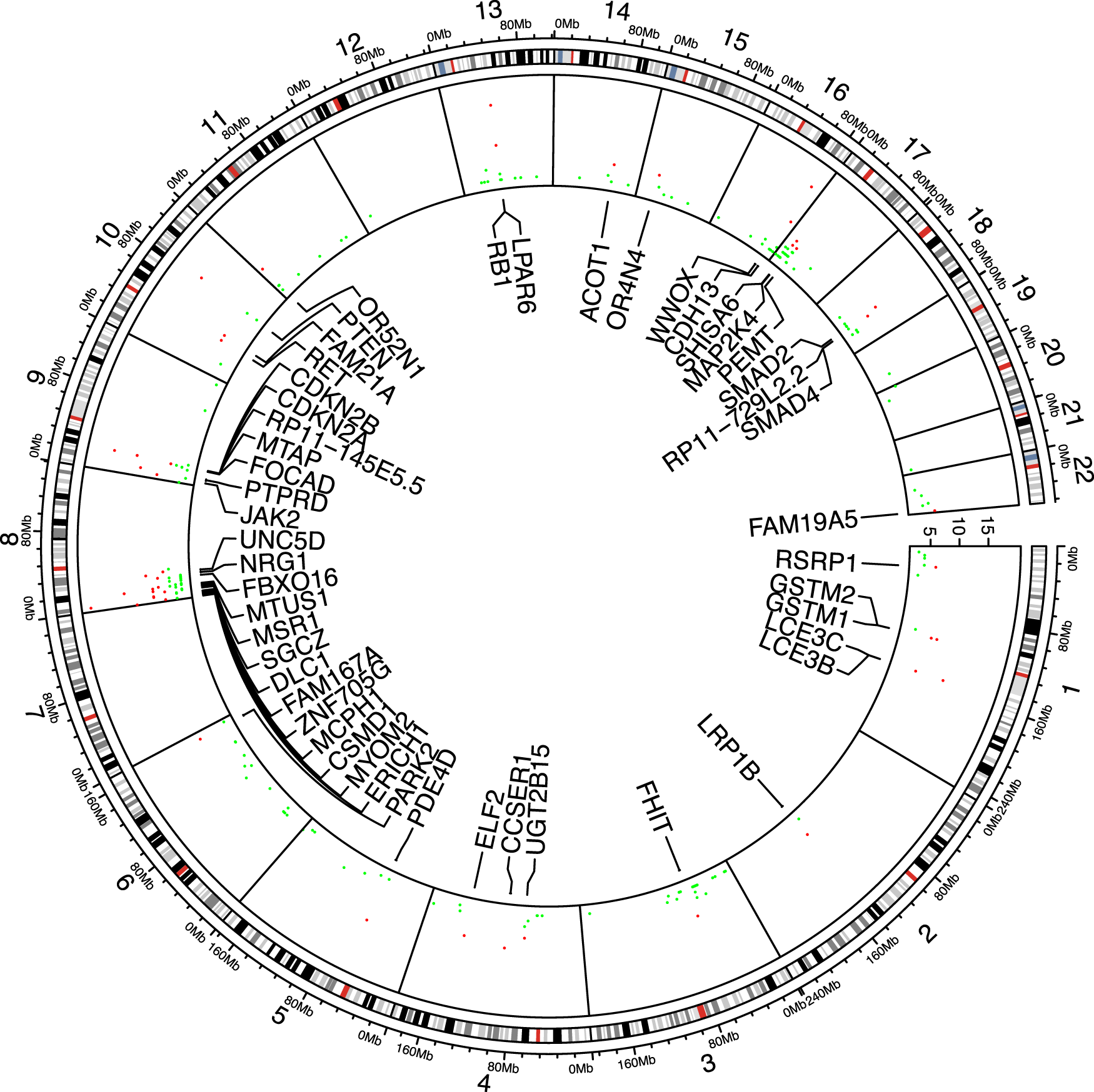 As many high-level regulators have alternative cancer-promoting roles depending on the cellular context, the evidence of their selective deletion in a multi-cancer analysis provides additional support for their relevance in oncogenic processes. Our results also point out genes with emerging cancer-related roles outside of classical cancer pathways such as GSTM1/GSTT1 in xenobiotic metabolism (Ginsberg et al., 2009), ELF2 as an ETS transcription factor regulating various biological pathways (Seth and Watson, 2005) or DLC1 as a Rho-GTPase activating protein regulating RhoA pathway in hepatocellular carcinoma (Xue et al., 2008). In addition, we have identified large genes residing in common fragile sites to be significantly affected by deletions and contributing to cancer development, including CSMD1, WWOX and FHIT (Smith et al., 2006).