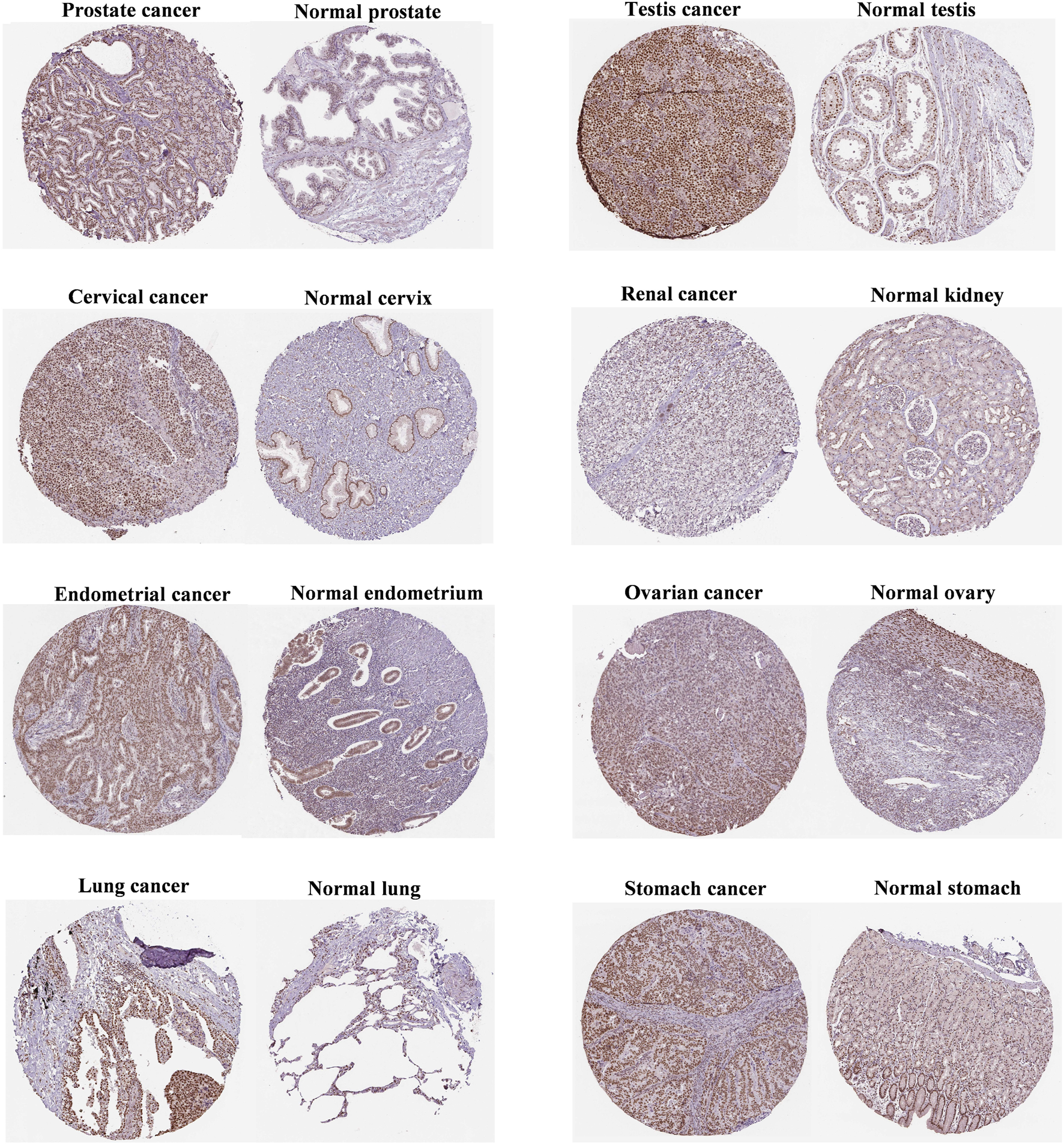 As shown in Figure 2, FANCE staining was higher in prostate, testis, and cervical cancers than in normal tissues. In addition, FANCE staining was lower in renal cancer than in normal tissues. These results were consistent with gene expression. FANCE staining observed no difference in endometrial, ovarian, lung, and gastric cancers compared with normal tissue.