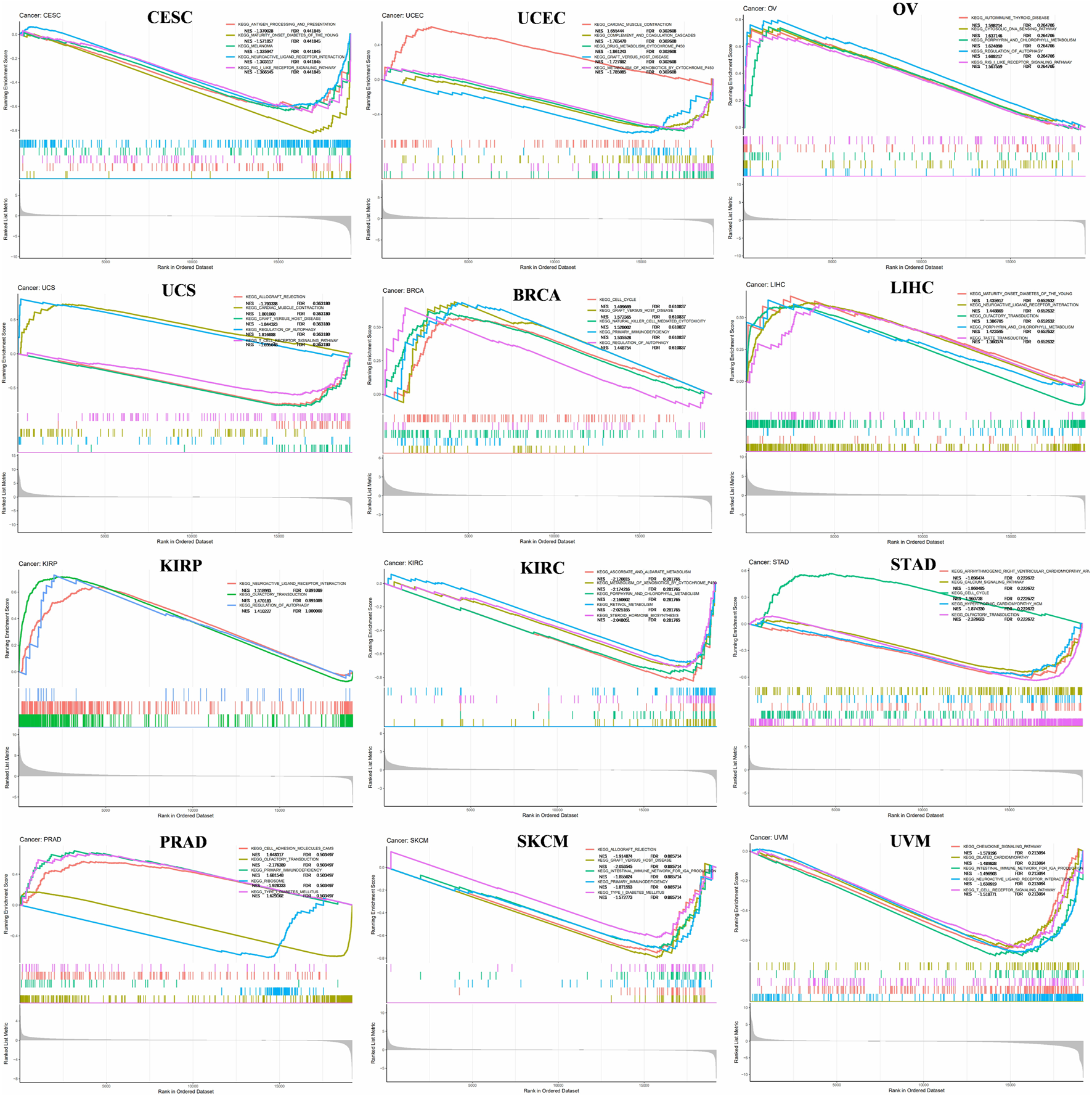 Gene set enrichment analysis (GSEA) of FANCE expression in cancers. The top five most relevant signaling pathways in the Kyoto Encyclopedia of Genes and Genomes (KEGG) dataset were displayed. Normalized Enrichment Score (NES) value and FDR value (qvalue) were displayed. Peaks on the upward curve indicate positive regulation and peaks on the downward curve indicate negative regulation.