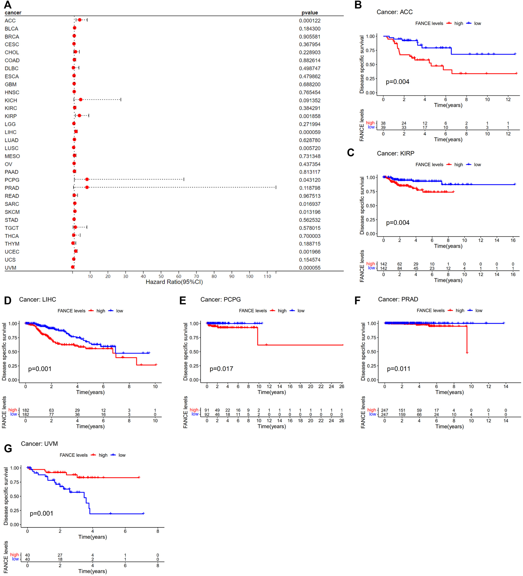 Correlation between FANCE expression and disease-specific survival (DSS) using data from the TGCA database. (A) Forest plot of FANCE expression and DSS in 32 cancers. (B–G) The Kaplan–Meier survival analysis for FANCE expression and DSS in six cancers. *p < .05; **p < .01; and ***p < .001.