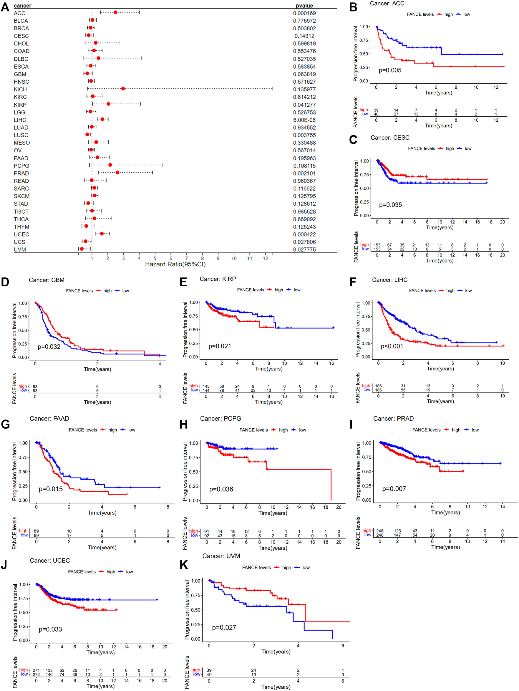 Correlation between FANCE expression and overall survival (OS) using data from the TGCA database. (A) Forest plot of FANCE expression and OS in 33 cancers. (B–K) The Kaplan–Meier survival analysis for FANCE expression and OS in 10 cancers. *p < .05; **p < .01; and ***p < .001.