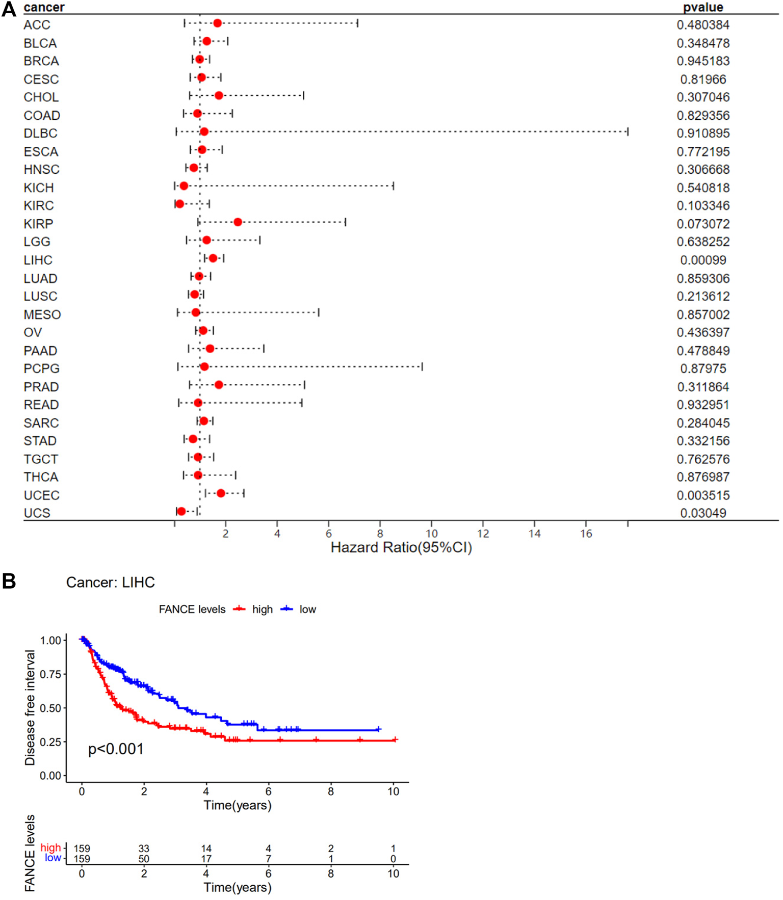 Correlation between FANCE expression and disease-free interval (DFI) using data from the TGCA database. (A) Forest plot of FANCE expression and DFI in 32 cancers. (B) The Kaplan–Meier survival analysis for FANCE expression and DFI in LIHC. *p < .05; **p < .01; and ***p < .001.