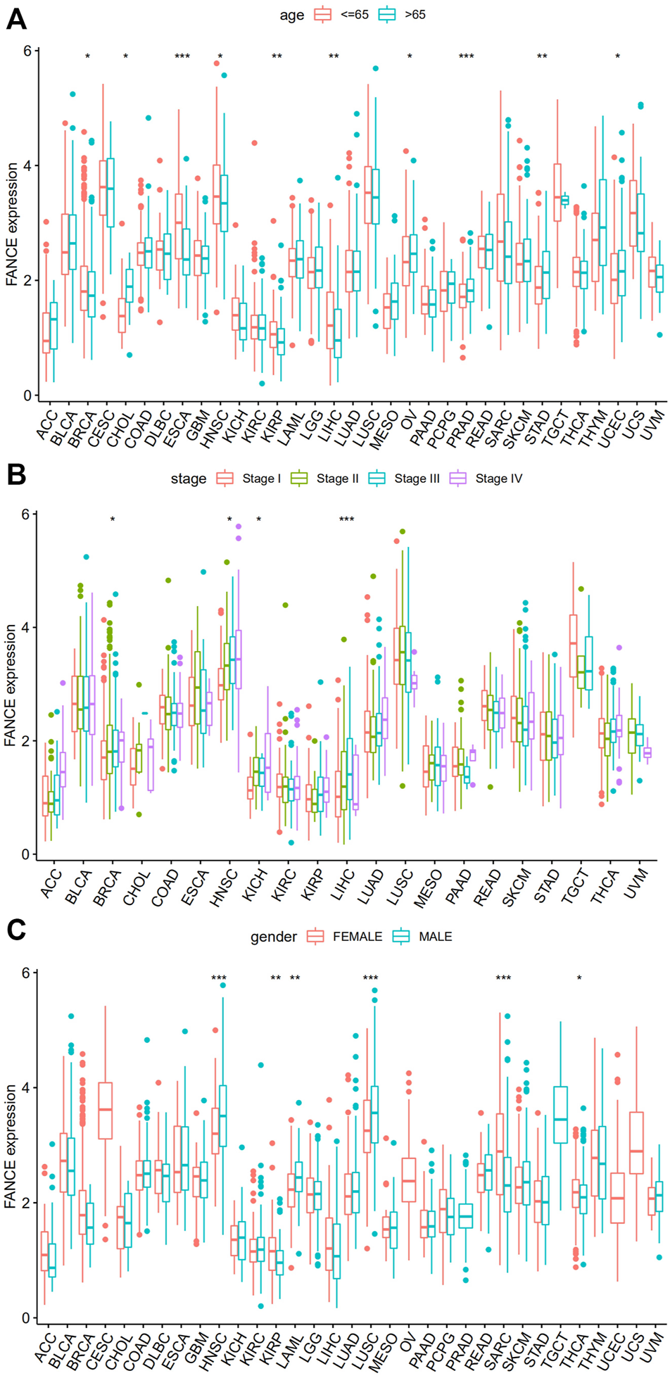 Correlation between FANCE expression and (A) age, (B) stage, and (C) gender in 33 cancers from TCGA database. *p < .05; **p < .01; and ***p < .001.