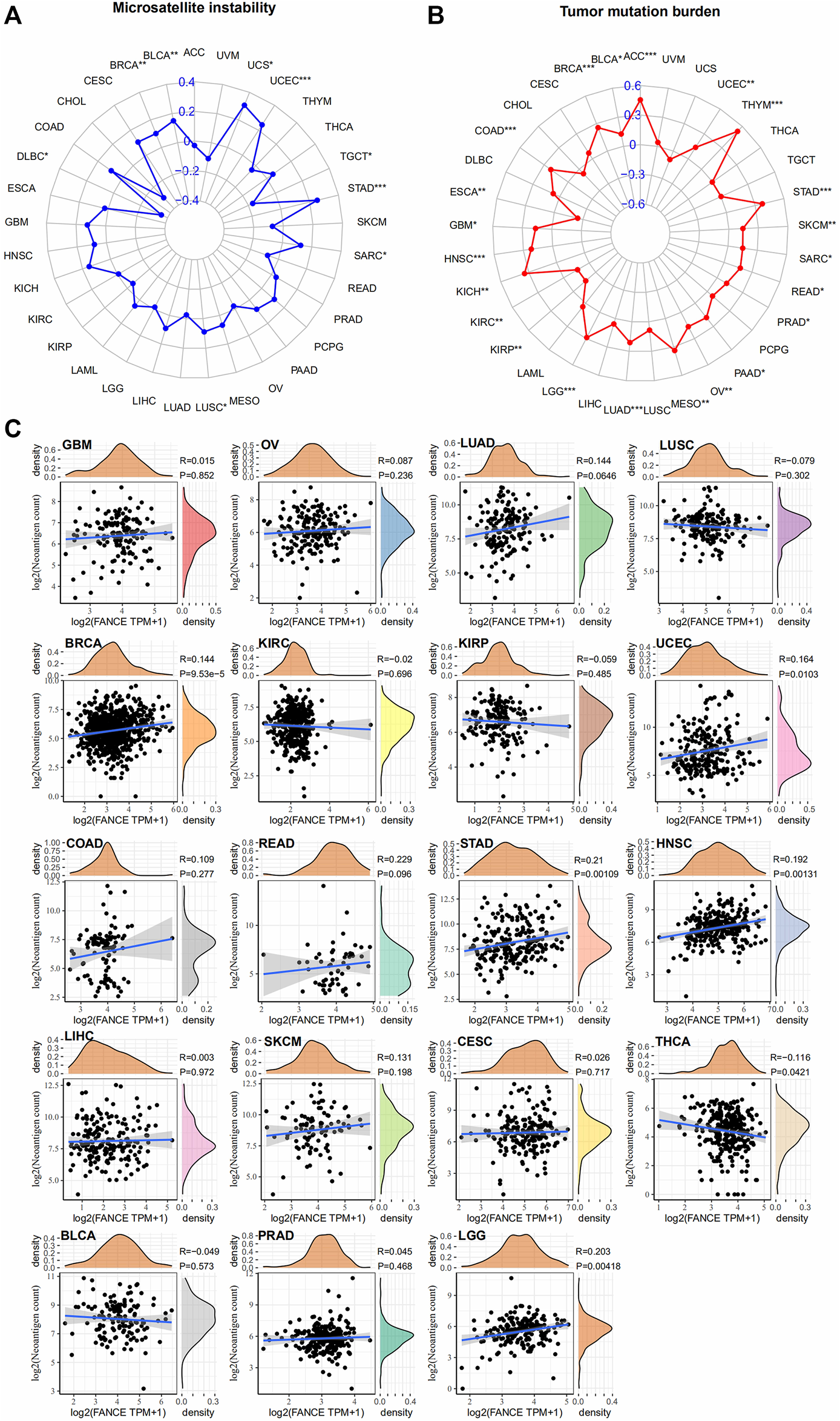 Correlation between FANCE expression and microsatellite instability (MSI) (A), tumor mutation burden (TMB) (B), and neoantigens (C) analysis in pan-cancer. *p < .05; **p < .01; and ***p < .001.