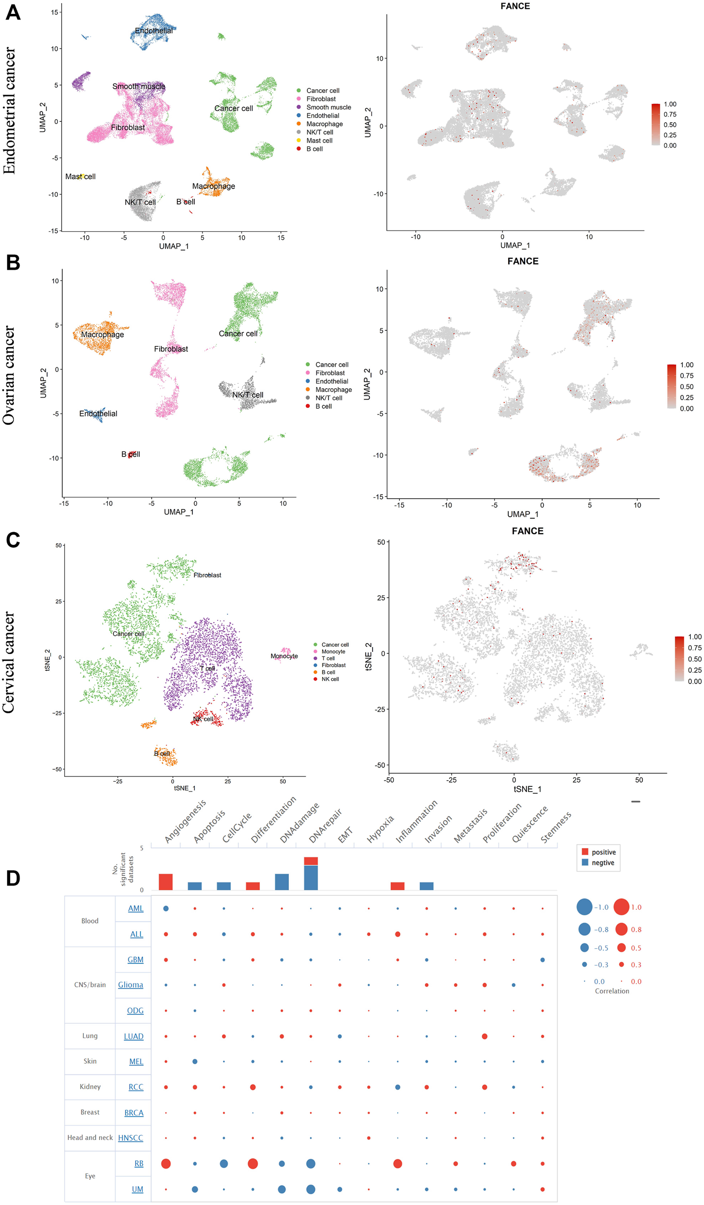ScRNA-seq data for endometrial cancer, ovarian cancer, and cervical cancer (GSE173682, GSM5236544, and GSM5236545) were downloaded from the Gene Expression Omnibus (GEO) database (https://www.ncbi.nlm.nih.gov/geo/). The Seurat package was used for normalization, feature selection, and clustering of the gene expression matrices. The selection method “vst” of Seurat was applied to pick the top 2,000 variable features. The UMAP and tSNE algorithms were applied for the dimensionality reduction of the data. The FindCluster function was used to cluster cells. SingleR was used to annotate cells automatically. The Cancer Single-cell Atlas (CancerSEA) database (https://biocc.hrbmu.edu.cn/CancerSEA/) was employed to explore the function of FANCE.
