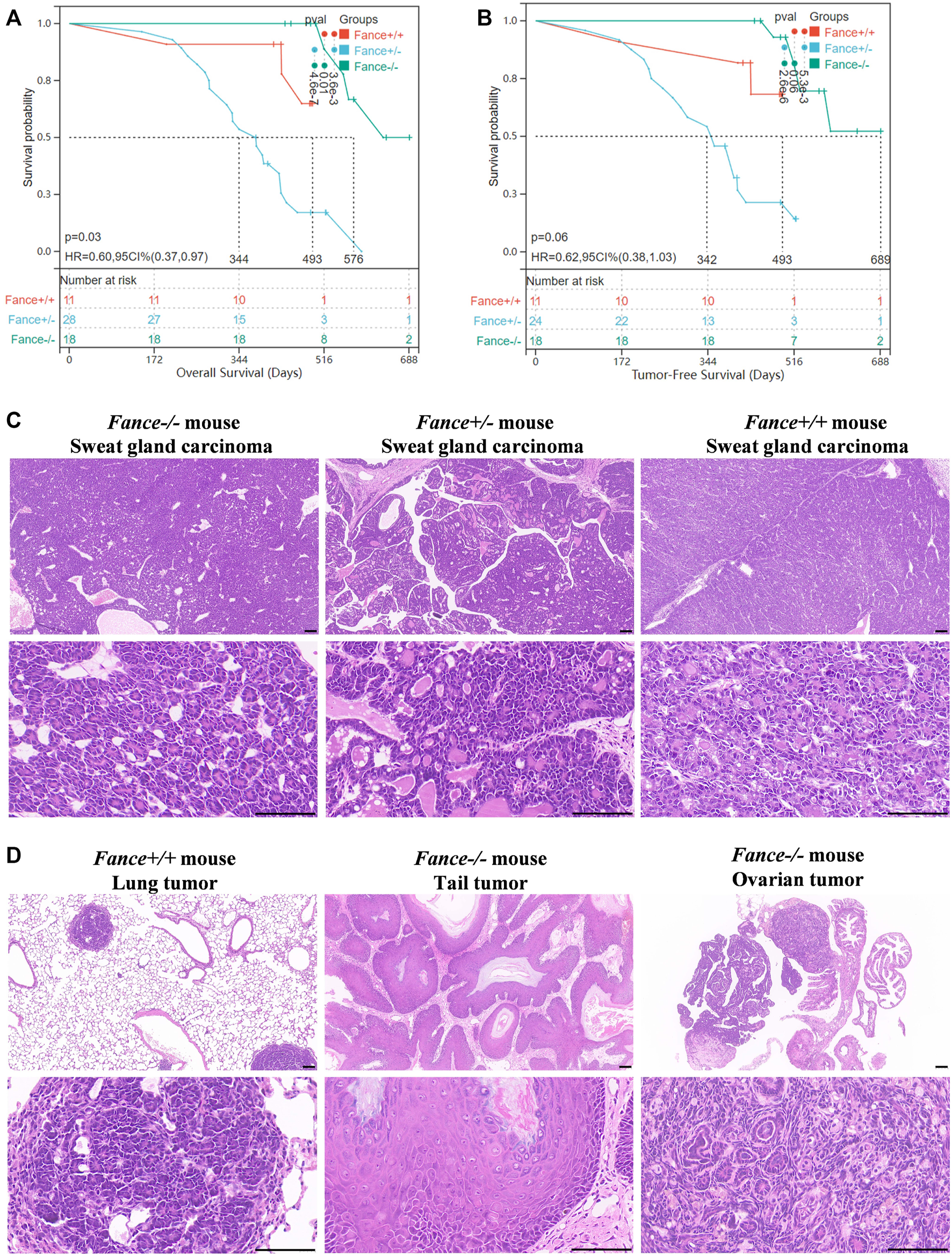 Survival curves and histology of carcinomas in Fance homozygous mice, Fance heterozygote mice, and wild-type mice with FVB/N background. Overall survival curves (A) and tumor-free survival curves (B) of the Fance−/−, Fance+/-, and Fance+/+ mice cohort. p values were determined by the Log-rank test. p < .05 was considered significantly different. (C) H&E-stained paraffin-embedded sections of sweat gland carcinoma in Fance−/−, Fance+/-, and Fance+/+ mice cohort. (D) Histology of tumors located at lung in Fance+/+ mice. Histology of tumors located at tail and ovary in Fance−/− mice. All scale label = 100 um.