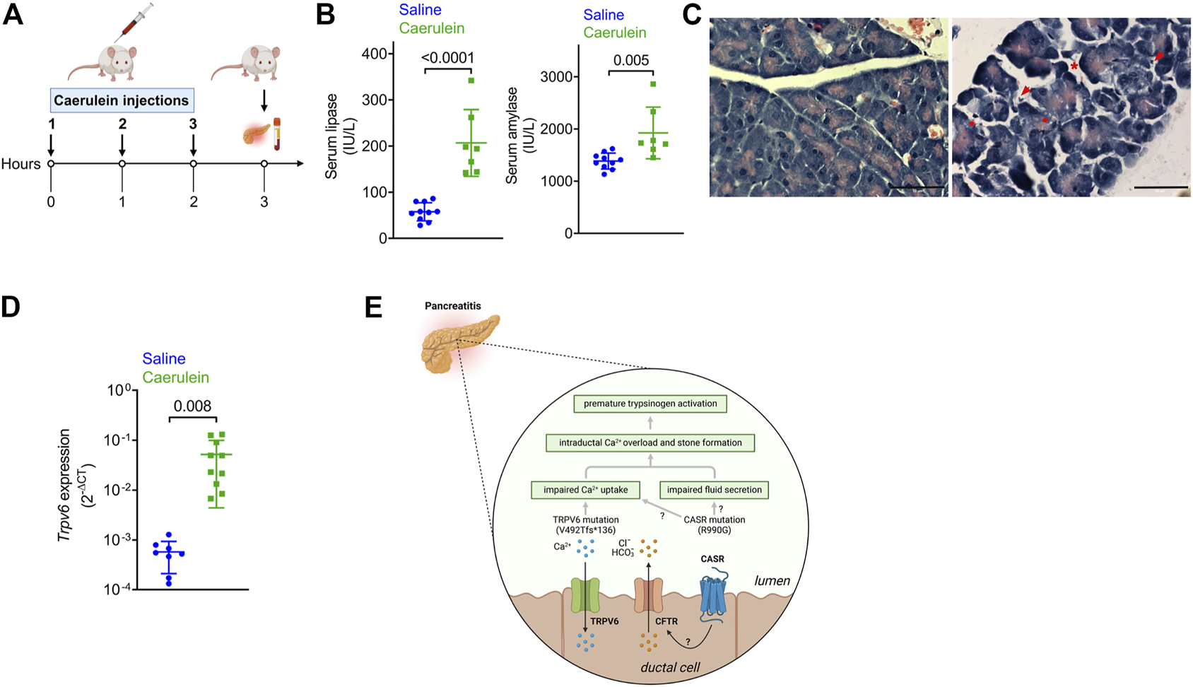 Expression of the genes in the pancreas following caerulein-induced early onset acute pancreatitis. (A) Schematic depicting the experimental protocol for caerulein-induced acute pancreatitis. The Figure was created with Biorender. (B) Serum lipase (left) and amylase (right) levels in mice injected with saline or caerulin. Data shown are mean ± standard deviation from experiments performed at least thrice and data points represent individual mice. (C) Representative images of hematoxylin and eosin-stained pancreatic tissue sections from mice injected with saline or caerulein. Arrows indicated infiltrated immune cells. * denotes edema and circles represent vacuolized acinar cells. Scale bar = 50 μm. (D). Real time quantitative PCR (RTqPCR) analysis of Trpv6 expression following caerulean-induced pancreatitis. Each point on the scatter plots represents data from a single mouse. The data are presented as the mean SD, and p values were calculated using the Student’s t-test. (E). Proposed mechanism underlying the role of defective TRPV6 in pancreatitis. Loss of function of TRPV6 in patients harboring the frameshift mutation can lead to impaired Ca2+ uptake from the ductal lumen. This can cause increased ductal Ca2+ concentrations, premature activation of trypsinogen (the product of PRSS1) and subsequent cellular damage and autodigestion. CASR is proposed to respond to high Ca2+ concentrations in the ductal lumen by triggering fluid and ion secretion, possibly through regulation of CFTR activity. The activating CASR p.R990G mutation sensitizes the receptor to Ca2+ thereby increasing fluid and ion secretion into the ducts leading to edema. The CASR p.R990G mutation may also cause impaired Ca2+ uptake in the pancreatic duct, as has been reported in the renal tubules. Based on this model, the cumulative effects of both TRPV6 and CASR mutations may cause Ca2+ overload in the ductal lumen and formation of stones, both of which are known risk factors for pancreatitis. The Figure was created with Biorender.