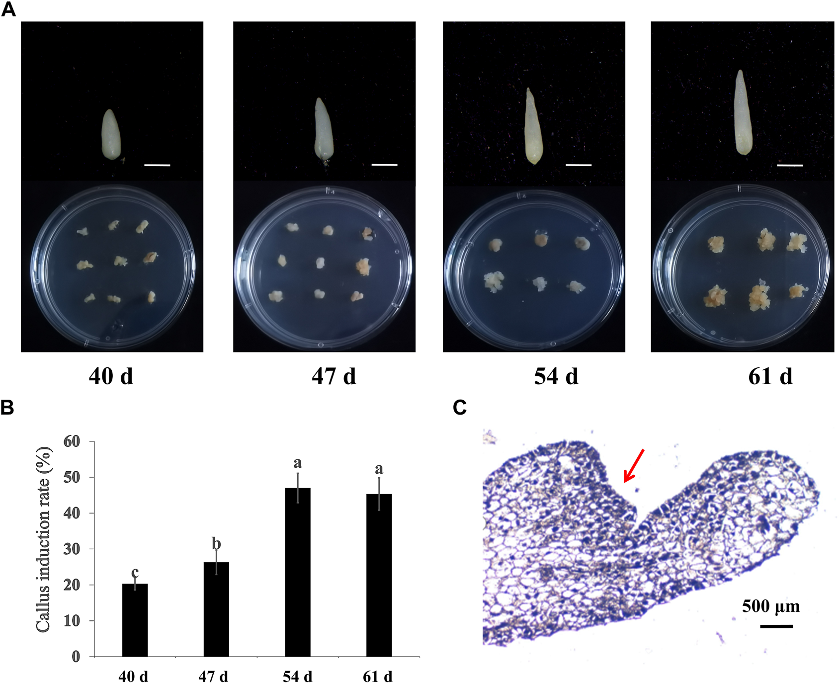 Embryonic callus induced from hybrid seeds embryo of cv. “Black Magic” × “Liming” at different maturity. (A) Induction of seed embryos at different stages and callus at 21 days. Scale bars, 500 μm (B) Callus induction rates of seed embryos of different maturity levels. (C) Paraffin section observation of embryogenic callus.