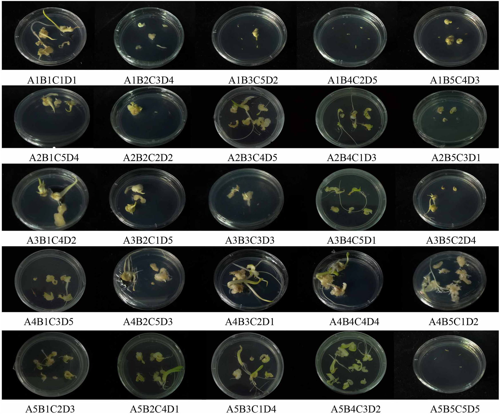 An orthogonal experimental design was used to maximize the influencing variables of embryogenic callus induction. Five levels were established for each component, including genotype, 6-BA concentration, NAA concentration and CNTs concentration. Compared to others, seed embryos in the treatment A4B5C1D2 generated a greater number of advent buds and quite a larger basal callus. Additionally, no callus formation was observed under A1B4C2D5 and A5B5C5D5 (Figure 2).