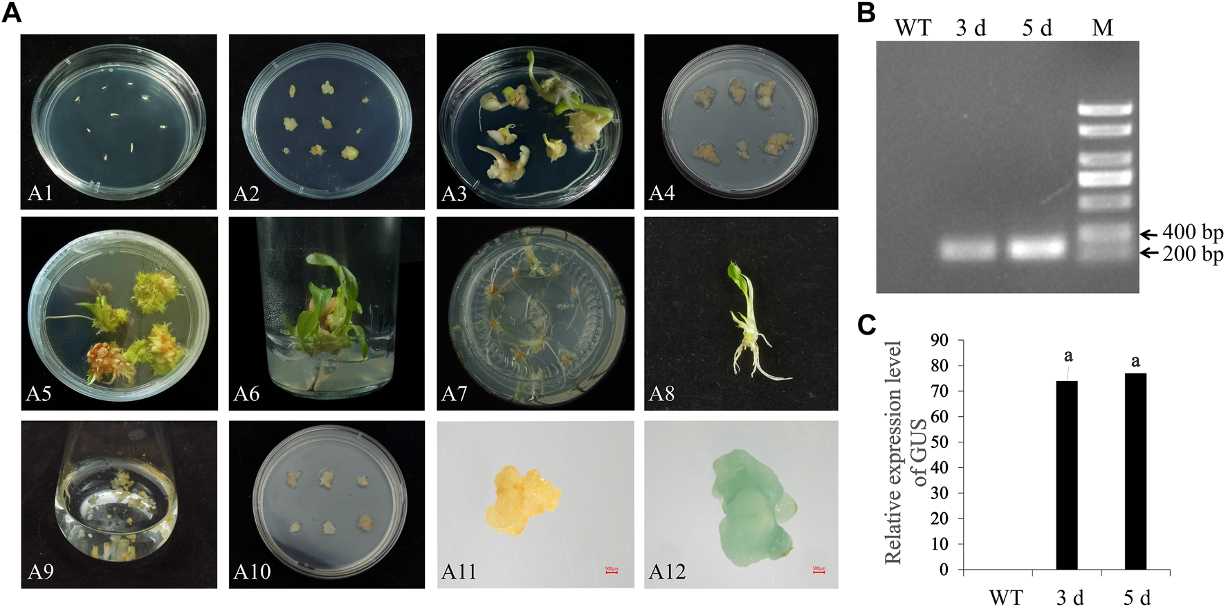 Somatic embryos were moved to a selective medium (SM), which contained MS supplemented with 300 mg/L cephalosporin and 8 mg/L hygromycin, under 16 h light and 8 h dark conditions for 2 days after co-culturing. Then assess the efficacy of somatic embryo transformation and discard any browned tissue. Somatic embryos with a diameter of more than 1 cm, as well as a healthy growth status were finally selected for GUS staining (Li et al., 2016). GUS staining was used to quickly identify the effect of gene transformation. Wild-type callus was used as control. All the callus was rinsed thrice in sterile water and stained in a 2 mmol/L XGluc (5-bromo-4-chloro-3-indolyl-d-glucuronide and cyclohexylammonium salt) solution overnight at 37°C. After staining, the callus was washed in 70% ethanol. It was immersed in the predetermined staining solution for 12 h, followed by observing the dyed somatic embryos using a microscope. Transient GUS expression was documented by recording the number of explants with at least one blue focus.