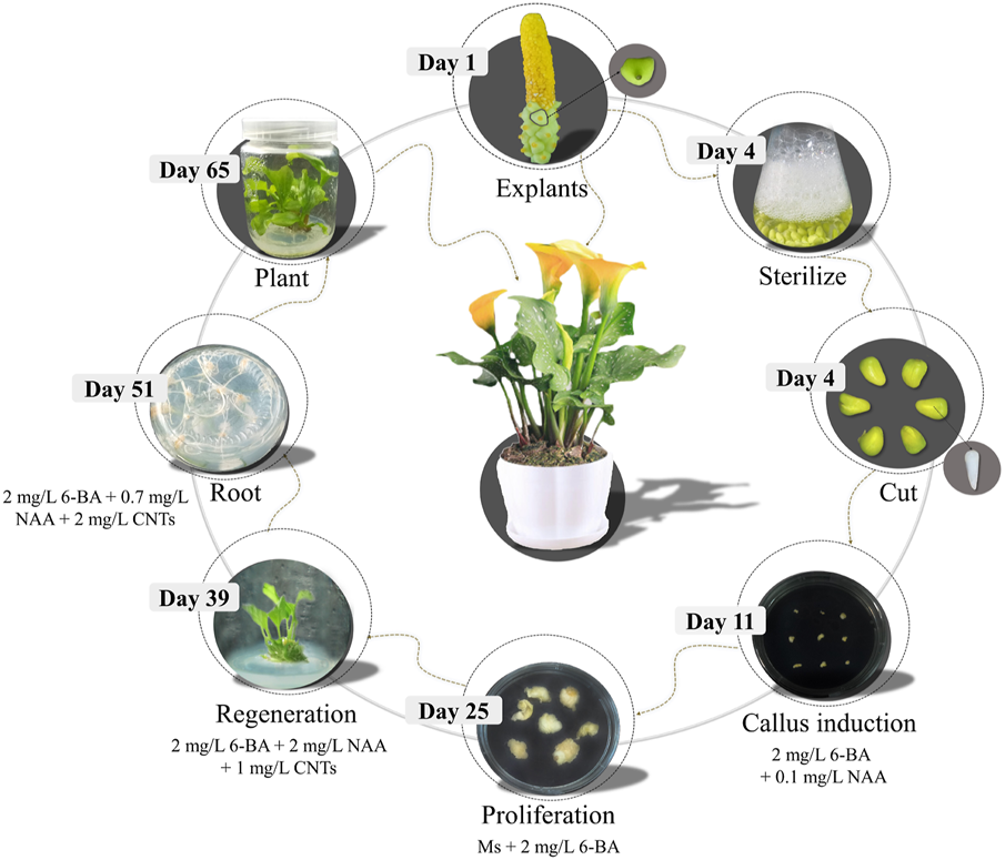 In addition, nanomaterials have increasingly become the most critical component influencing in vitro regeneration. Nanomaterials have unique physicochemical qualities with a large surface area and high reactivity. It may interact with a range of biological systems (Asgari-targhi et al., 2018), such as stimulating seed germination (Lahiani et al., 2013), impacting plant growth and development, and so on (Siddiqui and Al-Whaibi, 2014). Carbon nanotubes (CNTs) may facilitate the development of tobacco cell cultures in nanomaterials by organizing marker genes for cell division, cell wall construction, and water transport (Khodakovskaya et al., 2012). The addition of CNTs to the medium of Rubus glandularis may facilitate the germination and rooting processes in tissue culture (Flores et al., 2014). While seeds were utilized as explants in Catharanthus roseus, adding multi-walled CNTs to the culture medium may positively influence the proliferation and differentiation of callus (McGehee et al., 2019). C. roseus seedlings flourished on MS medium enriched with CNTs, and leaf length, leaf area, and root length all increased substantially (Ghasempour et al., 2019). Meanwhile, the addition of CNTs in Satureja khuzestanica expedited callus development and secondary metabolite production (Ghorbanpour and Hadian, 2015). In contrast, adding CNTs reduced the root elongation process in tomato and lettuce (Canas et al., 2008). Therefore, various plants respond differently to CNTs. It is uncertain what function CNTs have in calla lily tissue culture.
