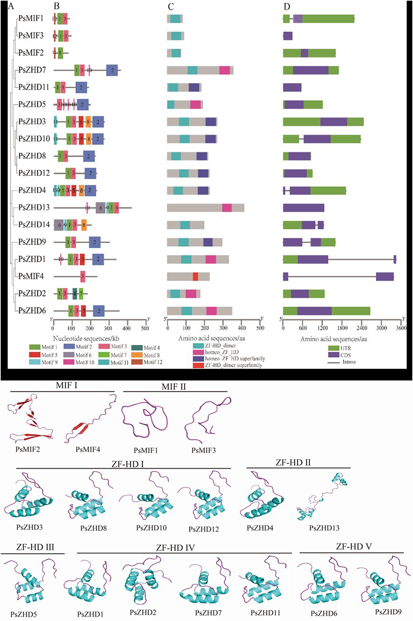 The phylogenetic tree classified the ZF-HD proteins into two subgroups, MIF and ZF-HD. MIF was further categorized into three branches (MIFâ… , â…¡, and â…¢), and the ZF-HD subgroup was further classified into five branches (ZF-HD I, II, IV, and V) (Figure 1). PsMIF2 and PsMIF4 were classified into the MIF I branch, and PsMIF1 and PsMIF3 were classified into the MIF II branch. MIF III does not contain pea ZF-HD family members; the ZHD I subpopulation contains PsZHD8, 12, 3, and 10; the ZHD II subpopulation contains PsZHD4, 13 and 14; the ZHD III subpopulation contains PsZHD5; the ZHD IV subpopulation contains PsZHD1, 7, 11 and two; and ZHD V subpopulation contains PsZHD6 and 9. This evolutionary tree differs individually from that formed by the pea PsZF-HD family protein sequences and domain motifs, but it is highly consistent with the evolutionary tree generated by the CDS. Notably, the ZF-HD family has not diverged in the evolution of monocot and dicot plants.