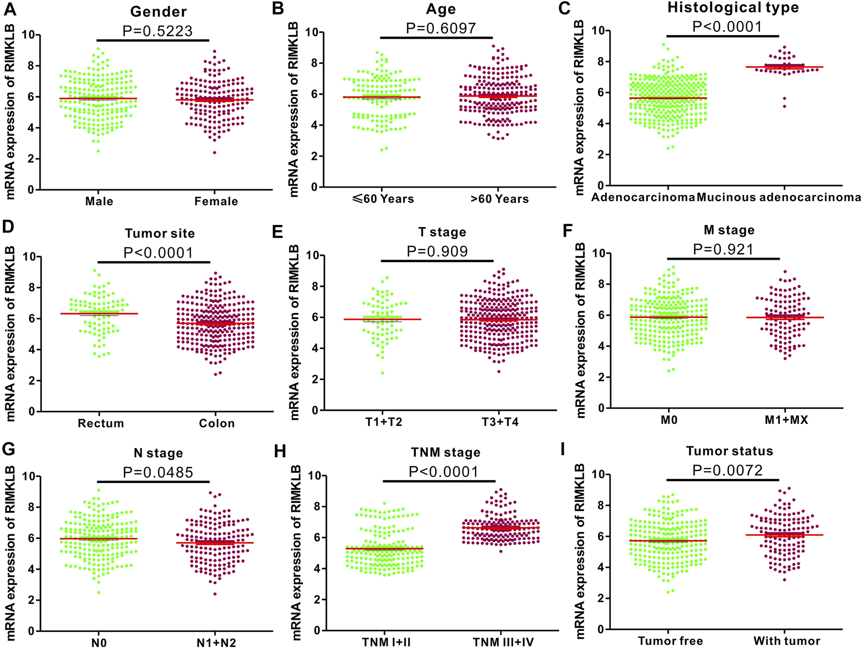 Correlation between RIMKLB mRNA expression and clinical indexes of CRC patients from TCGA database. RIMKLB mRNA expression is stratified with scatter plots using the TCGA dataset by gender (A), gender (B), histological type (C), Tumor site (D), T stage (E), M stage (F), N stage (G), TNM stage (H), and Tumor status (I).