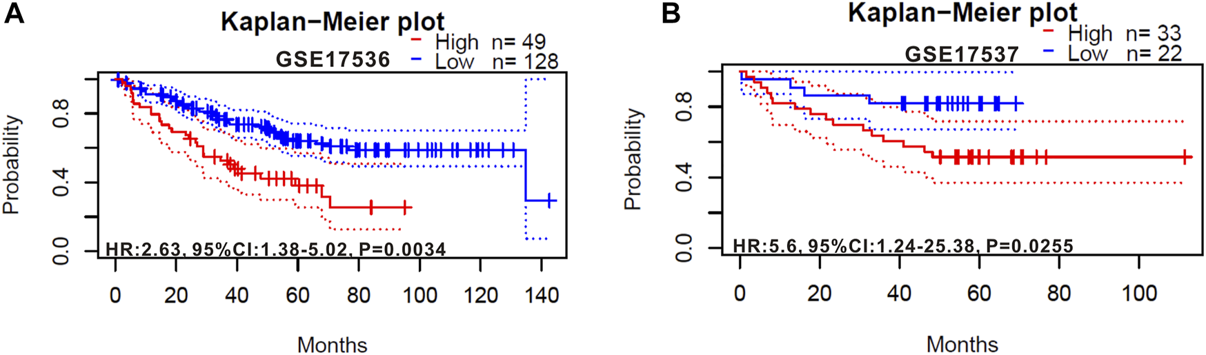 Kaplan-Meier survival curves comparing the high and low expression of RIMKLB in colorectal cancer in the PrognoScan. (A) Survival curves of OS colorectal cancer cohorts of GSE17536 (n = 177); (B) Survival curves of OS colorectal cancer cohorts of GSE17537 (n = 55).